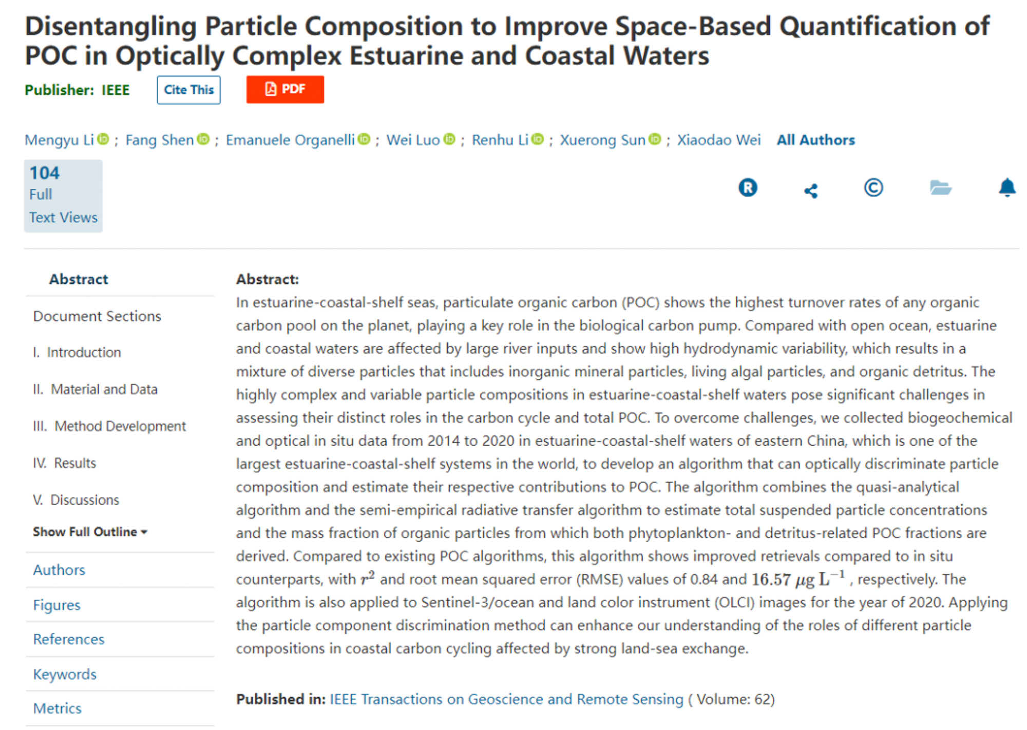 研究成果以 Disentangling Particle Composition to Improve Space-Based Quantification of POC in Optically Complex Estuarine and Coastal Waters 为题,2024年1月26日正式发表于地球科学领域期刊 IEEE Transactions on Geoscience and Remote Sensing。