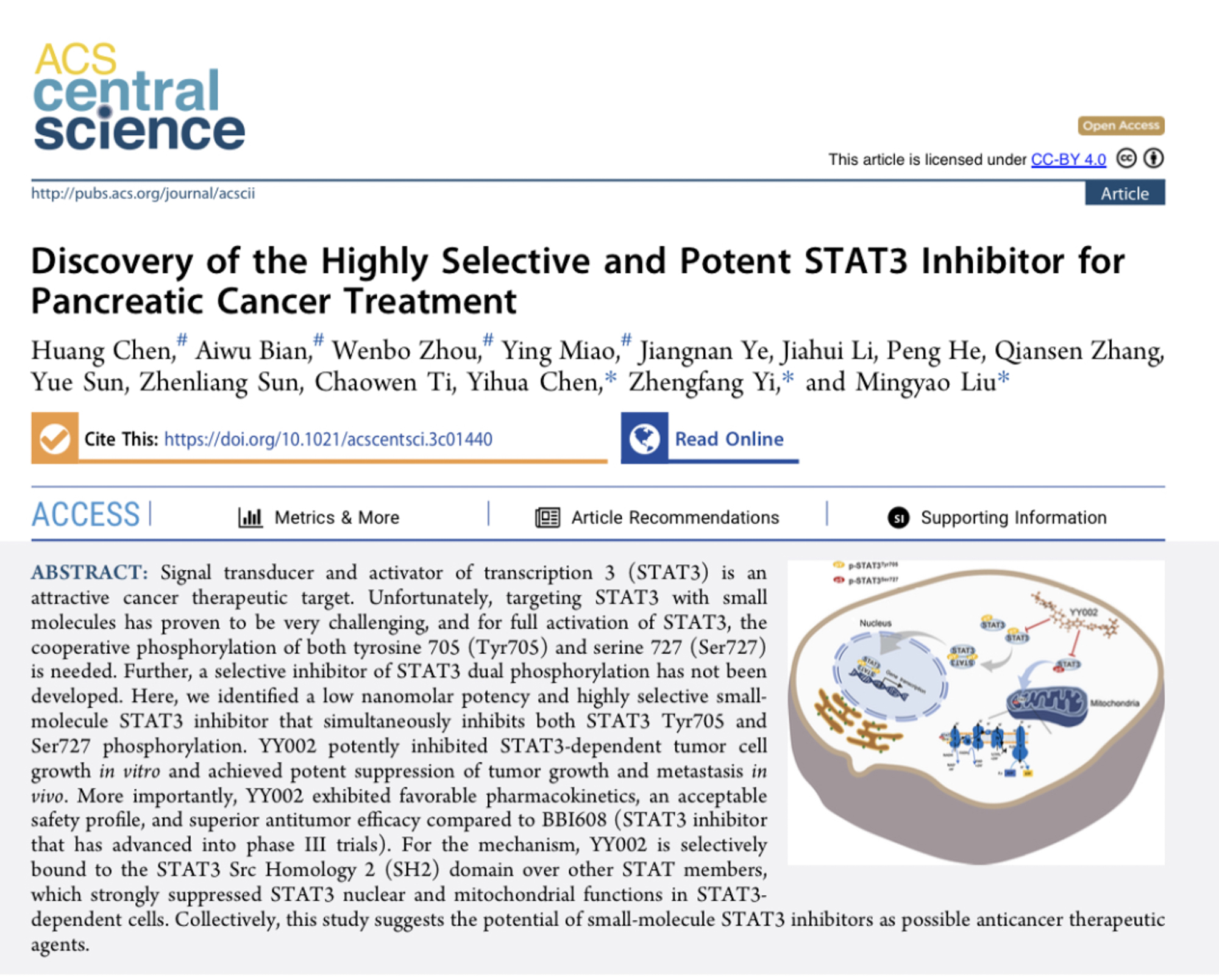 3245澳门新莆京生命科学学院刘明耀教授团队与上海宇耀生物科技有限公司携手开展产学研用创新合作,近期在美国化学会国际权威期刊 ACS Central Science在线发表研究论文 Discovery of the highly selective and potent STAT3 inhibitor for pancreatic cancer treatment。