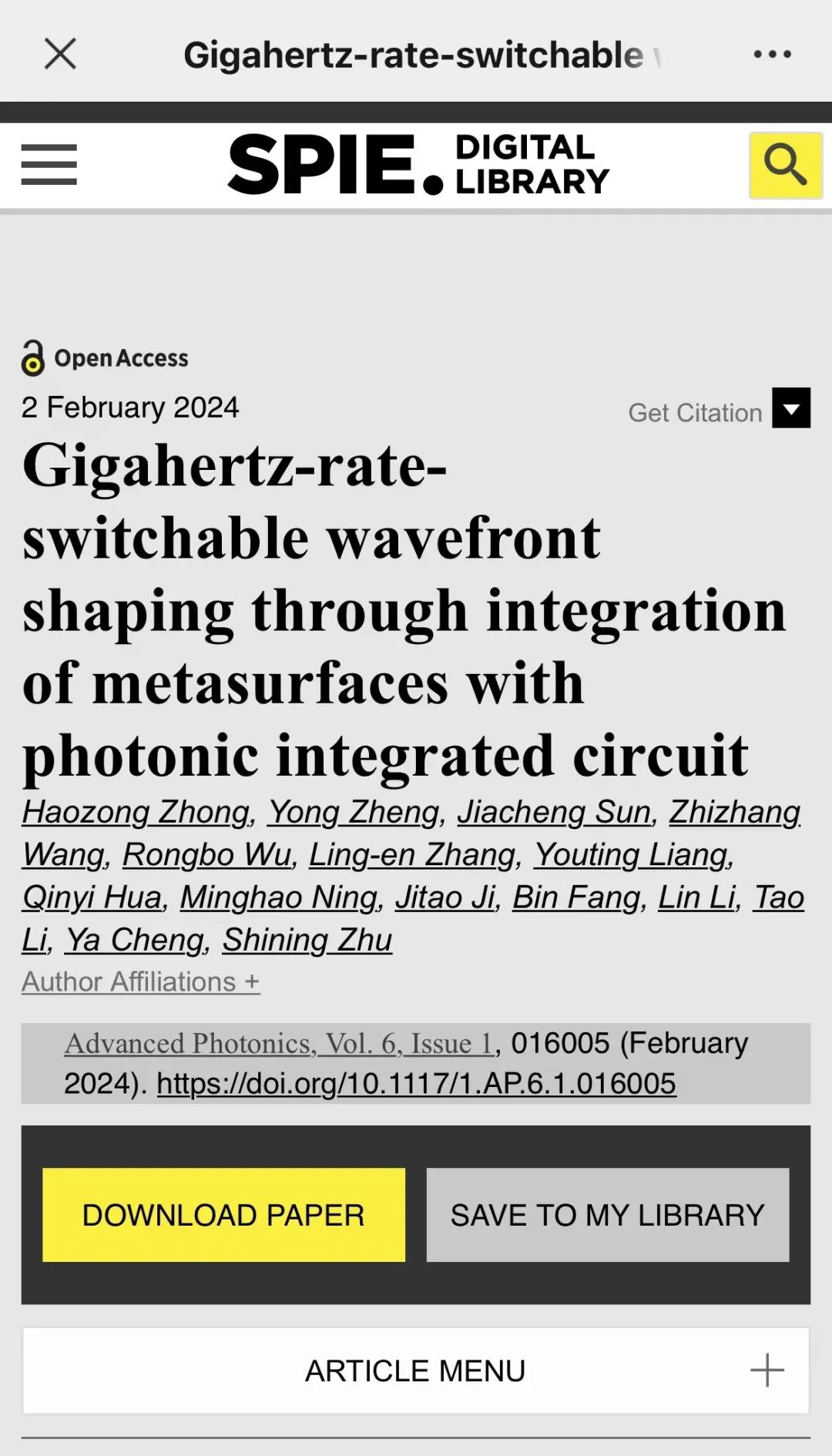 高速、高效的多自由度动态光场调控是光学领域一个重要挑战。近期,3245澳门新莆京精密光谱科学与技术国家重点实验室程亚教授和李林研究员团队与南京大学的科研人员合作,通过将超构表面与铌酸锂薄膜(LNOI)集成光子芯片结合,实现了光场的高速动态调控,并首次成功展示了GHz级可切换的波前整形,为高速动态光场调控提供了全新的思路。相关工作发表于 Advanced Photonics,研究生钟浩宗、郑勇、孙嘉程为本文共同第一作者,程亚教授、李林研究员为共同通讯作者。