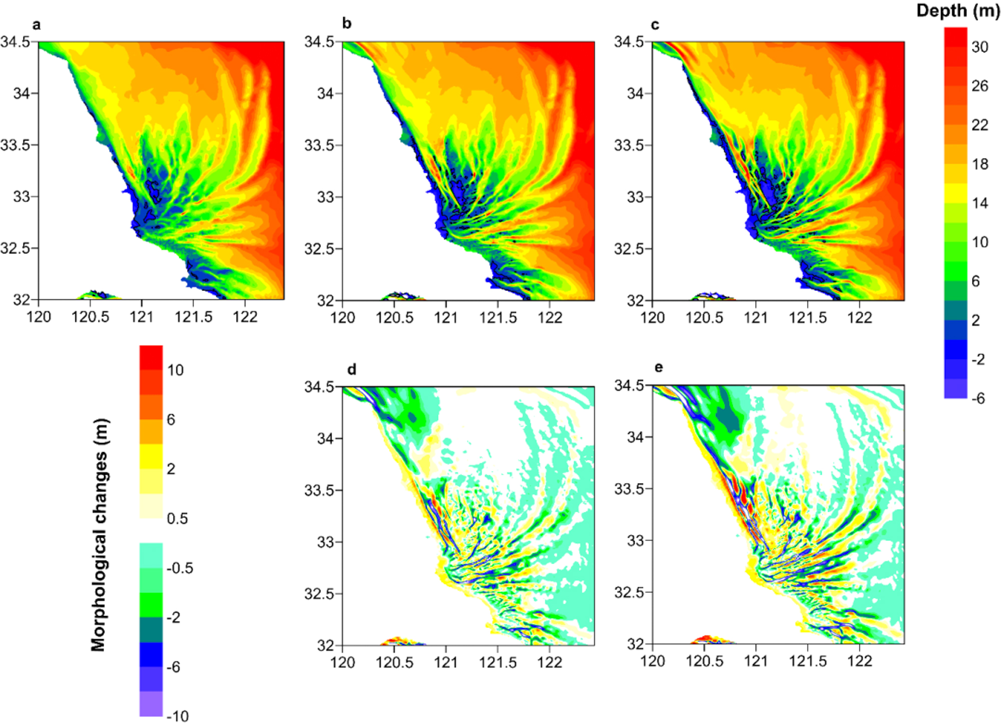 d、e分别为1979-2017、1979-2059年海底地形变化(正值表示淤积,负值表示冲刷)