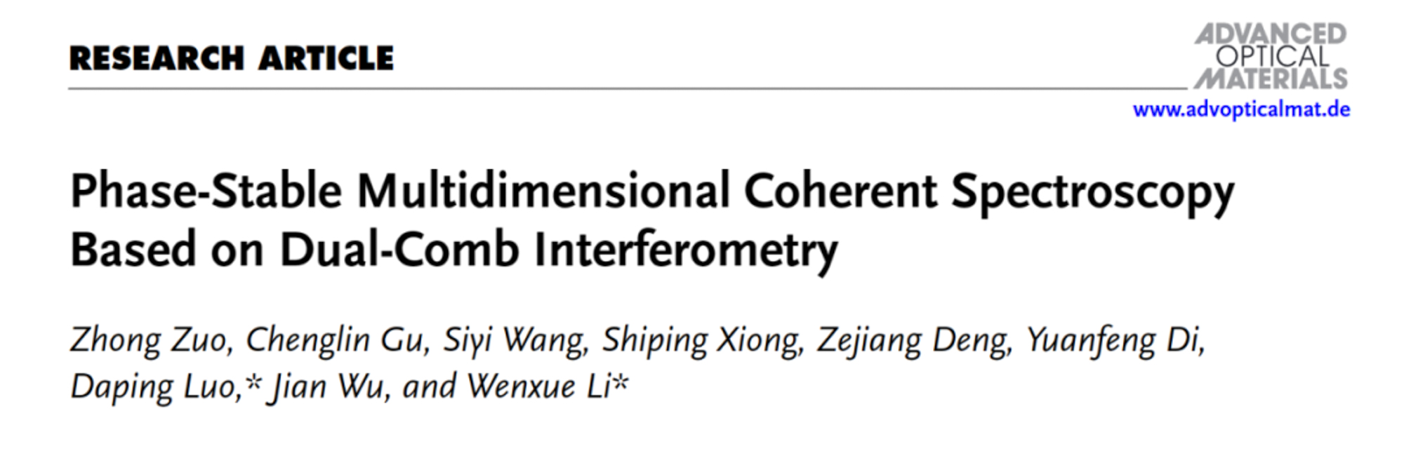 相关成果以 Phase‐Stable Multidimensional Coherent Spectroscopy Based on Dual‐Comb Interferometry 为题在 Advanced Optical Materials 在线发表。李文雪研究员和罗大平副研究员为共同通讯作者,左众副研究员和顾澄琳研究员为本文共同第一作者。