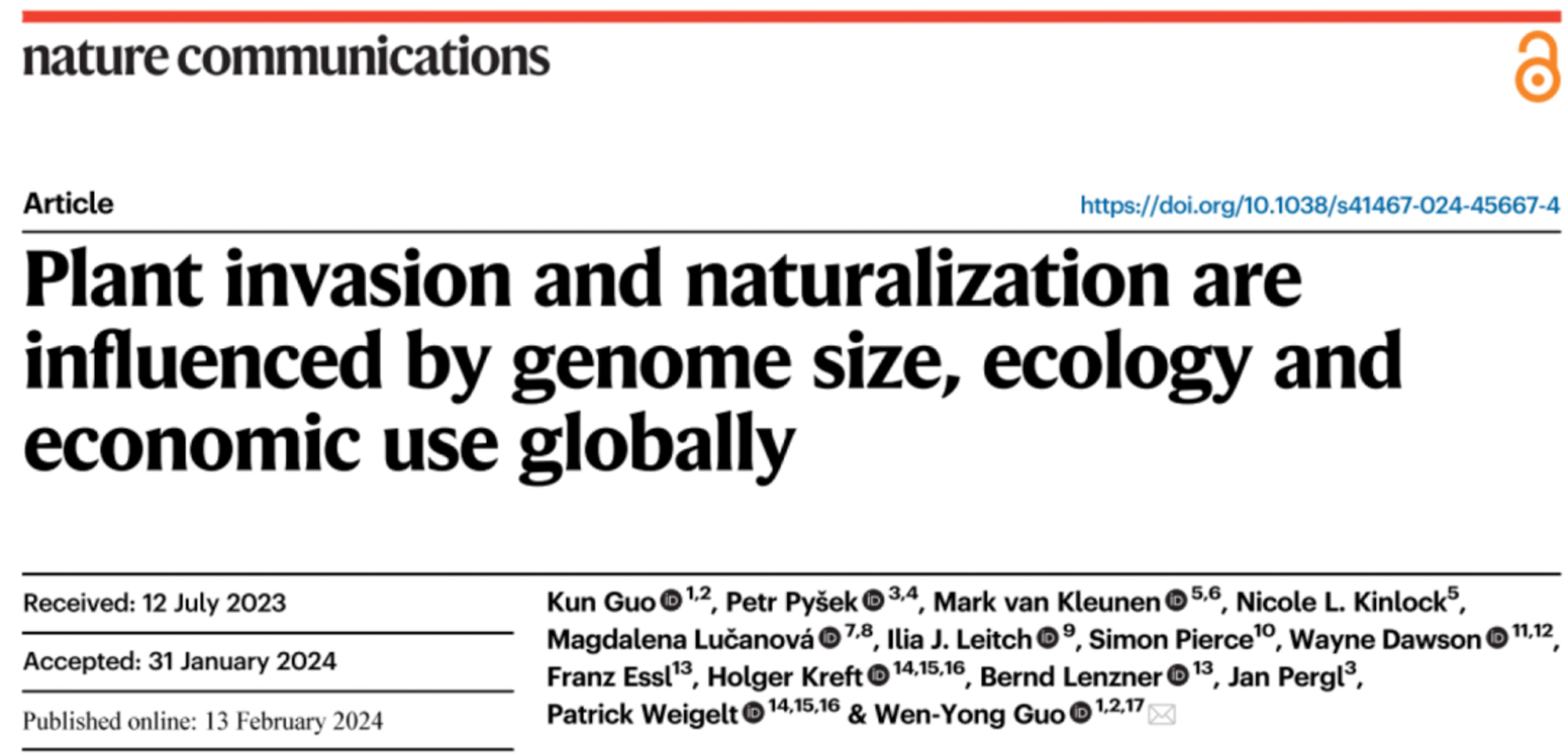相关成果发表于 Nature Communications 期刊,郭文永研究员为通讯作者,团队博士后郭坤为第一作者。该研究是该团队针对“哪些物种更易成功入侵”这一入侵生态学核心问题系列研究的阶段性整合。