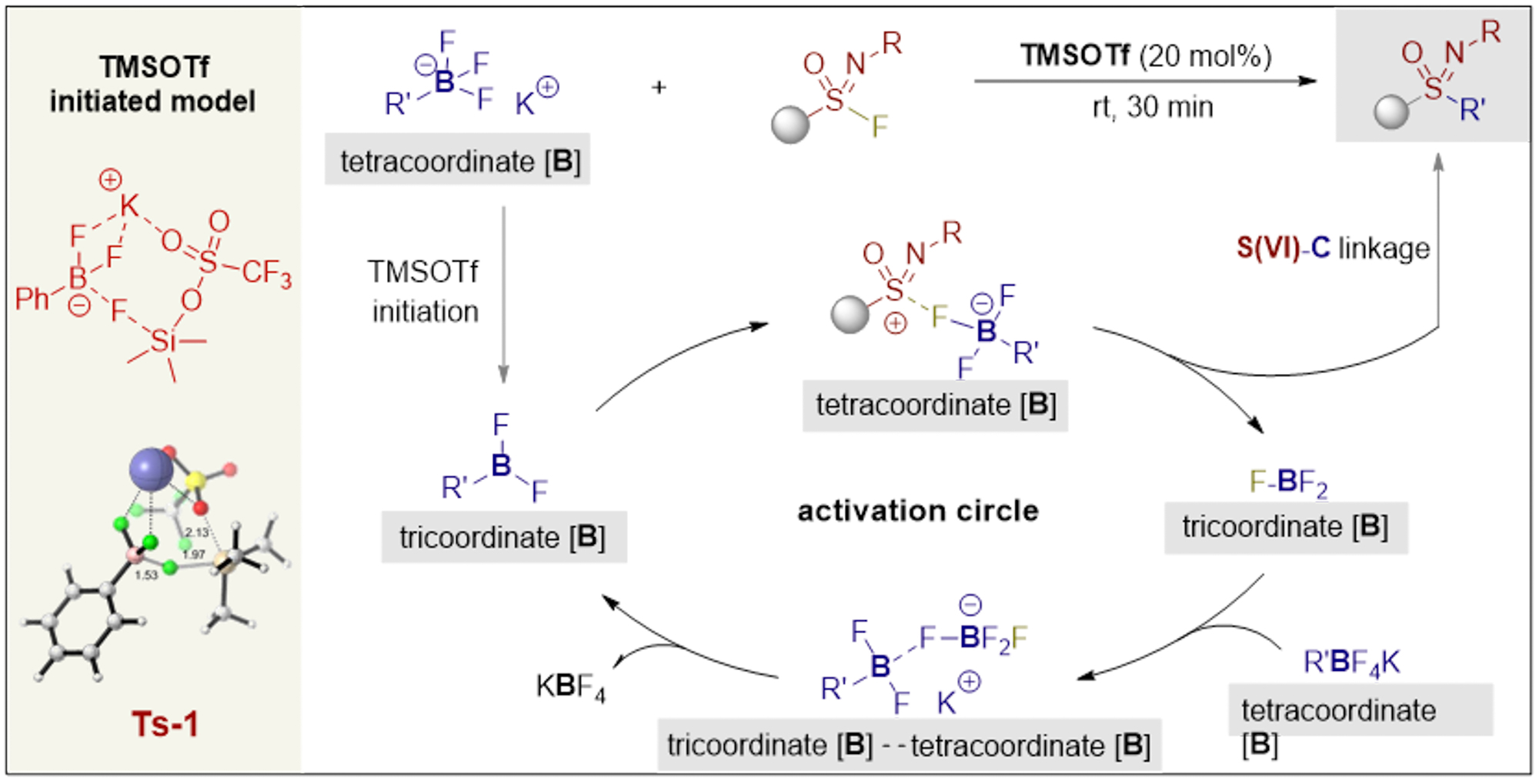 近期,他们实现了S(VI)与芳基碳的C–SuFEx高效链接:使用催化量硅基Lewis酸作为活化试剂,利用Si–F键(BDE = 135 kcal/mol)的强结合能,使其与有机三氟硼酸钾作用,现场解离缓释三氟化硼实现接力催化,通过三配位/四配位硼的催化循环,首次实现了芳基碳的C–SuFEx链接。