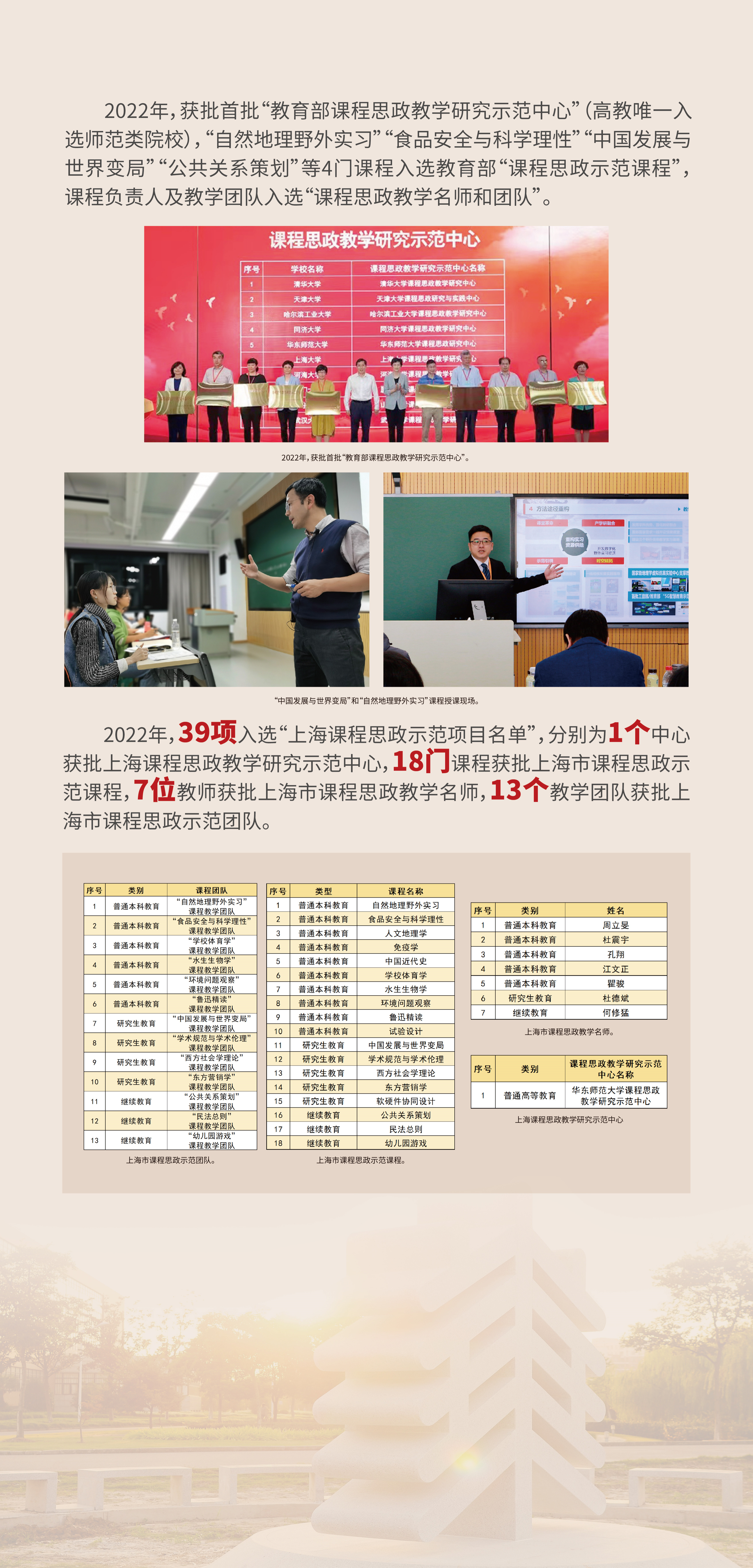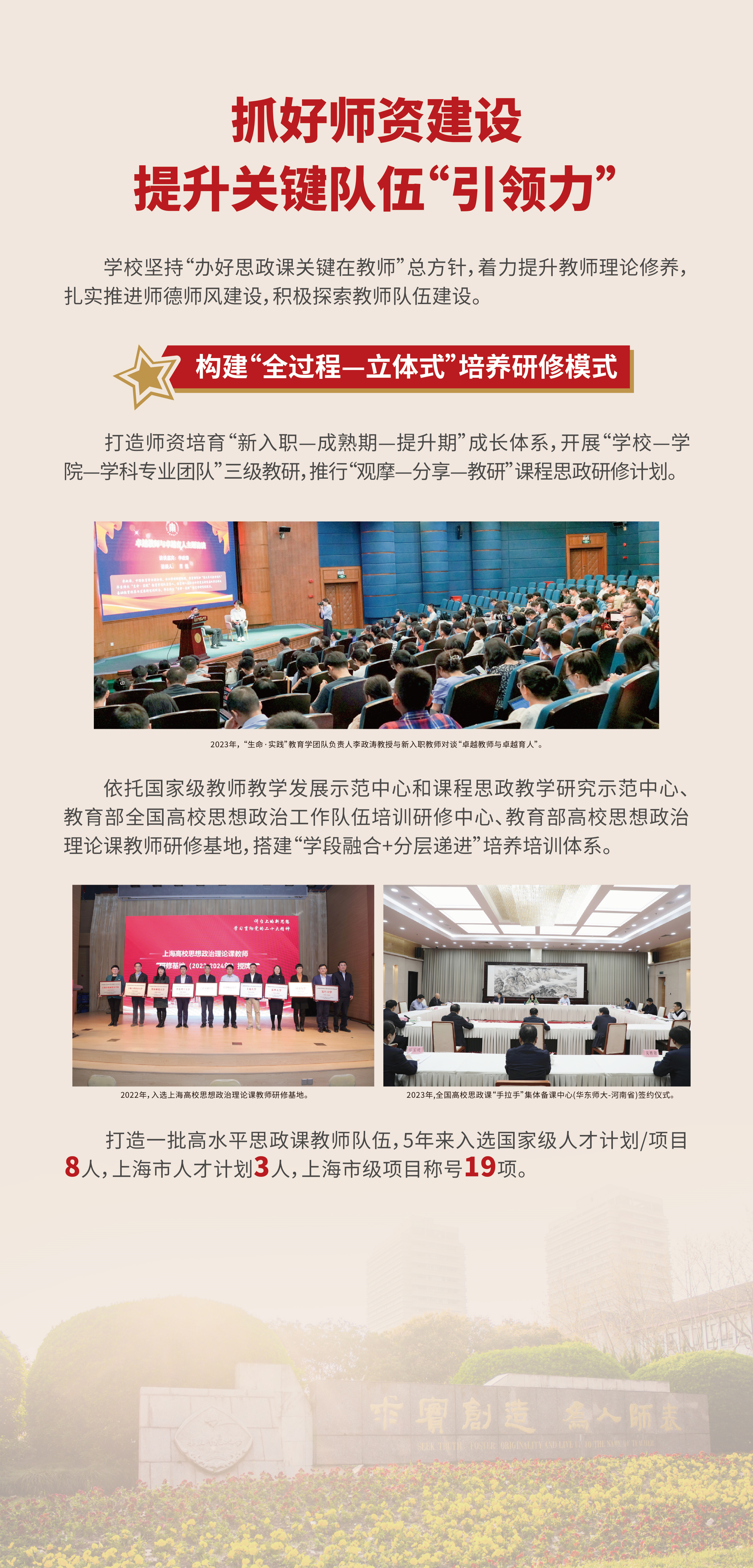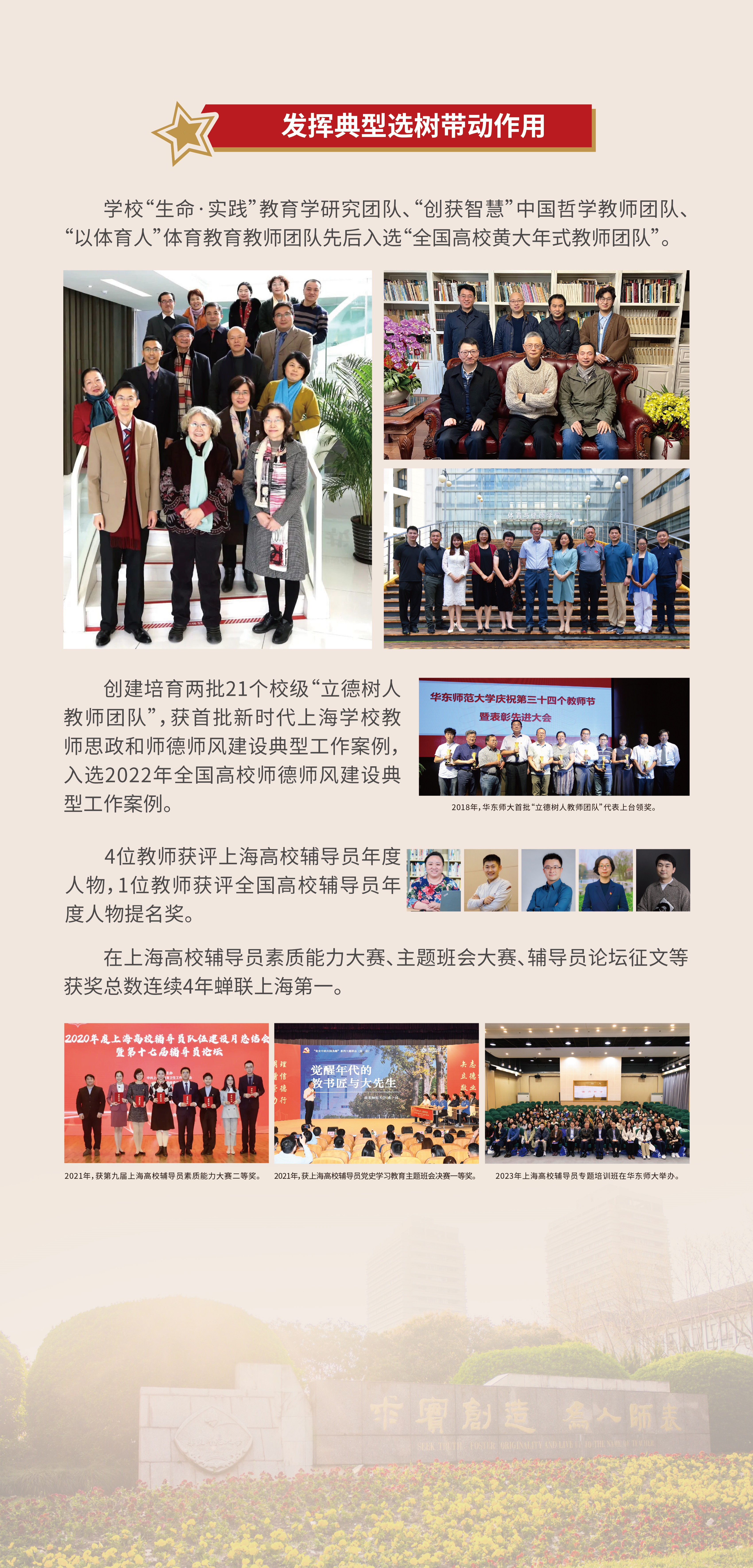 发挥典型选树的带动作用。学校在持续选优建强关键队伍、加大学术领军人才引育力度的同时,注重以马克思主义学科发展中起重要作用的“大先生”为线索,展示“为学、为事、为人”风采,增强教师队伍的学科归属和学科自信。五年来,学校创建培育两批21个校级“立德树人教师团队”,团队建设经验获首批新时代上海学校教师思政和师德师风建设典型工作案例,并入选2022年全国高校师德师风建设典型工作案例。通过打造孟宪承、刘佛年、陈彪如等知名学者学术成就陈列馆,出版《师魂》《文脉》等系列丛书,学校不断激励、带动教师自觉担当为人为师为学的使命。学校“生命·实践”教育学研究团队、“创获智慧”中国哲学教师团队、“以体育人”体育教育教师团队先后入选“全国高校黄大年式教师团队”,践行并传承教育家精神。学校还支持辅导员专业化成长,修订辅导员队伍建设办法,完善分类选聘、发展培养、考核管理等,分阶段规划辅导员队伍发展,支撑高质量思想政治教育。获评上海高校辅导员年度人物4人、全国高校辅导员年度人物提名奖1人,在上海高校辅导员素质能力大赛、主题班会大赛、辅导员论坛征文等获奖总数连续4年蝉联上海第一。