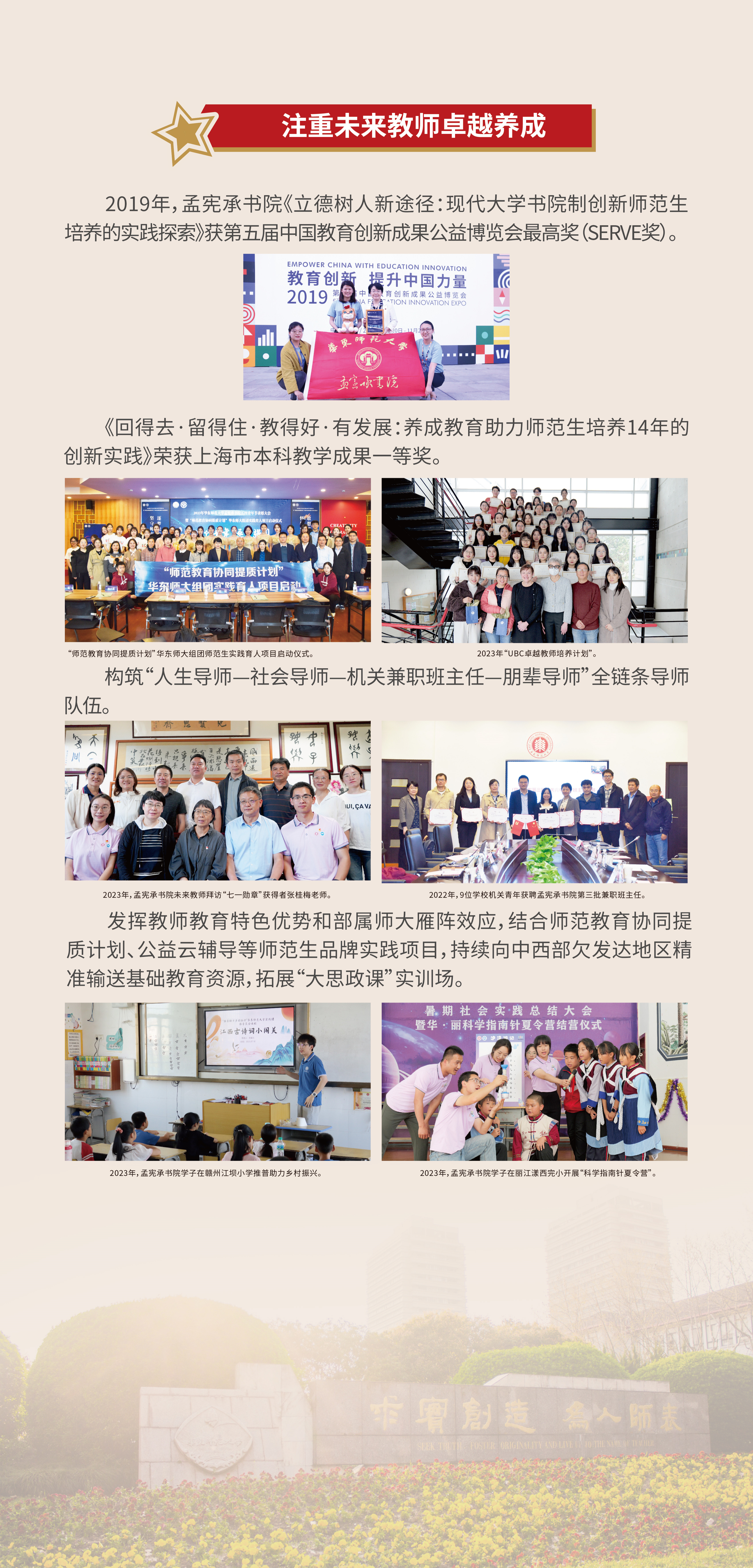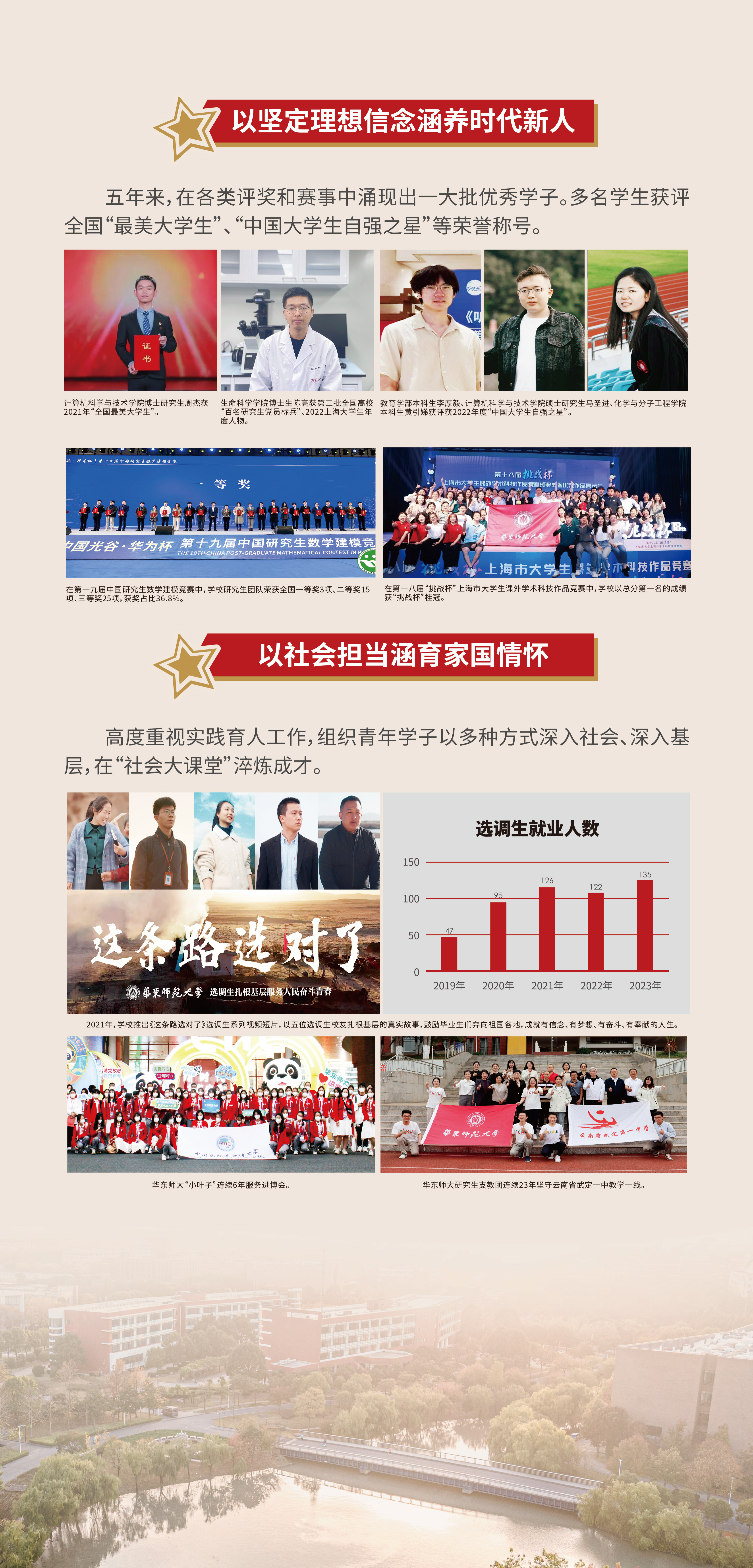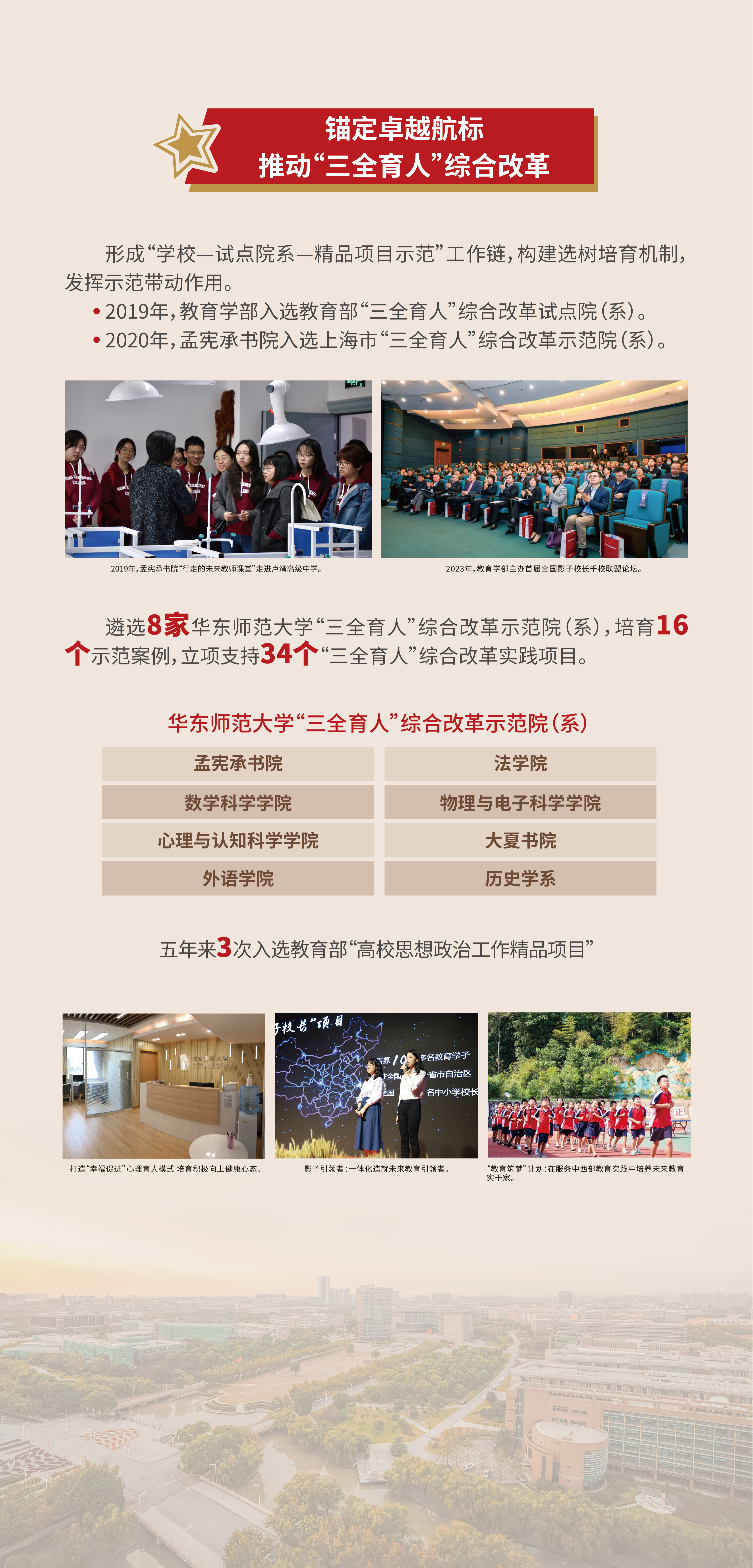 发挥典型选树的带动作用。学校在持续选优建强关键队伍、加大学术领军人才引育力度的同时,注重以马克思主义学科发展中起重要作用的“大先生”为线索,展示“为学、为事、为人”风采,增强教师队伍的学科归属和学科自信。五年来,学校创建培育两批21个校级“立德树人教师团队”,团队建设经验获首批新时代上海学校教师思政和师德师风建设典型工作案例,并入选2022年全国高校师德师风建设典型工作案例。通过打造孟宪承、刘佛年、陈彪如等知名学者学术成就陈列馆,出版《师魂》《文脉》等系列丛书,学校不断激励、带动教师自觉担当为人为师为学的使命。学校“生命·实践”教育学研究团队、“创获智慧”中国哲学教师团队、“以体育人”体育教育教师团队先后入选“全国高校黄大年式教师团队”,践行并传承教育家精神。学校还支持辅导员专业化成长,修订辅导员队伍建设办法,完善分类选聘、发展培养、考核管理等,分阶段规划辅导员队伍发展,支撑高质量思想政治教育。获评上海高校辅导员年度人物4人、全国高校辅导员年度人物提名奖1人,在上海高校辅导员素质能力大赛、主题班会大赛、辅导员论坛征文等获奖总数连续4年蝉联上海第一。