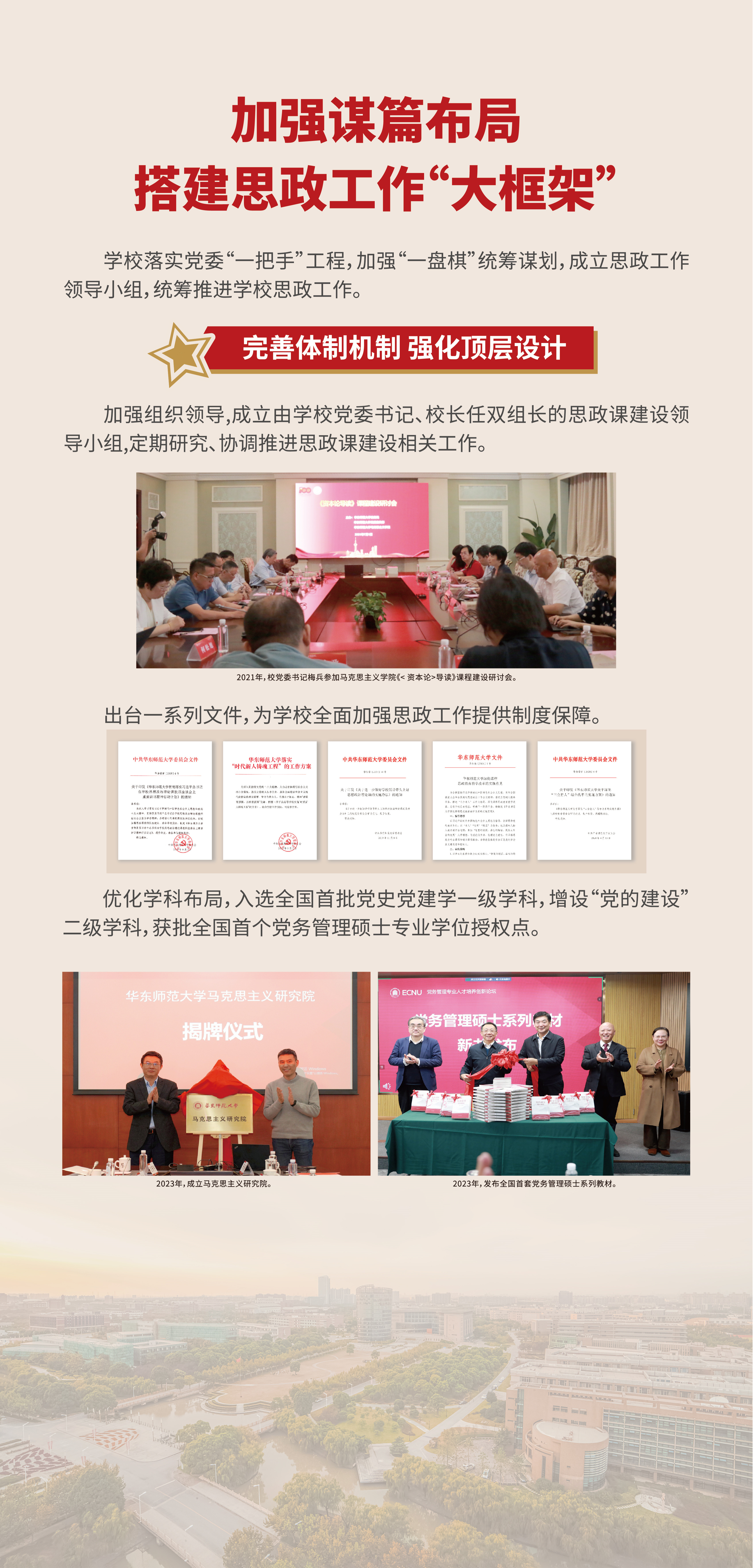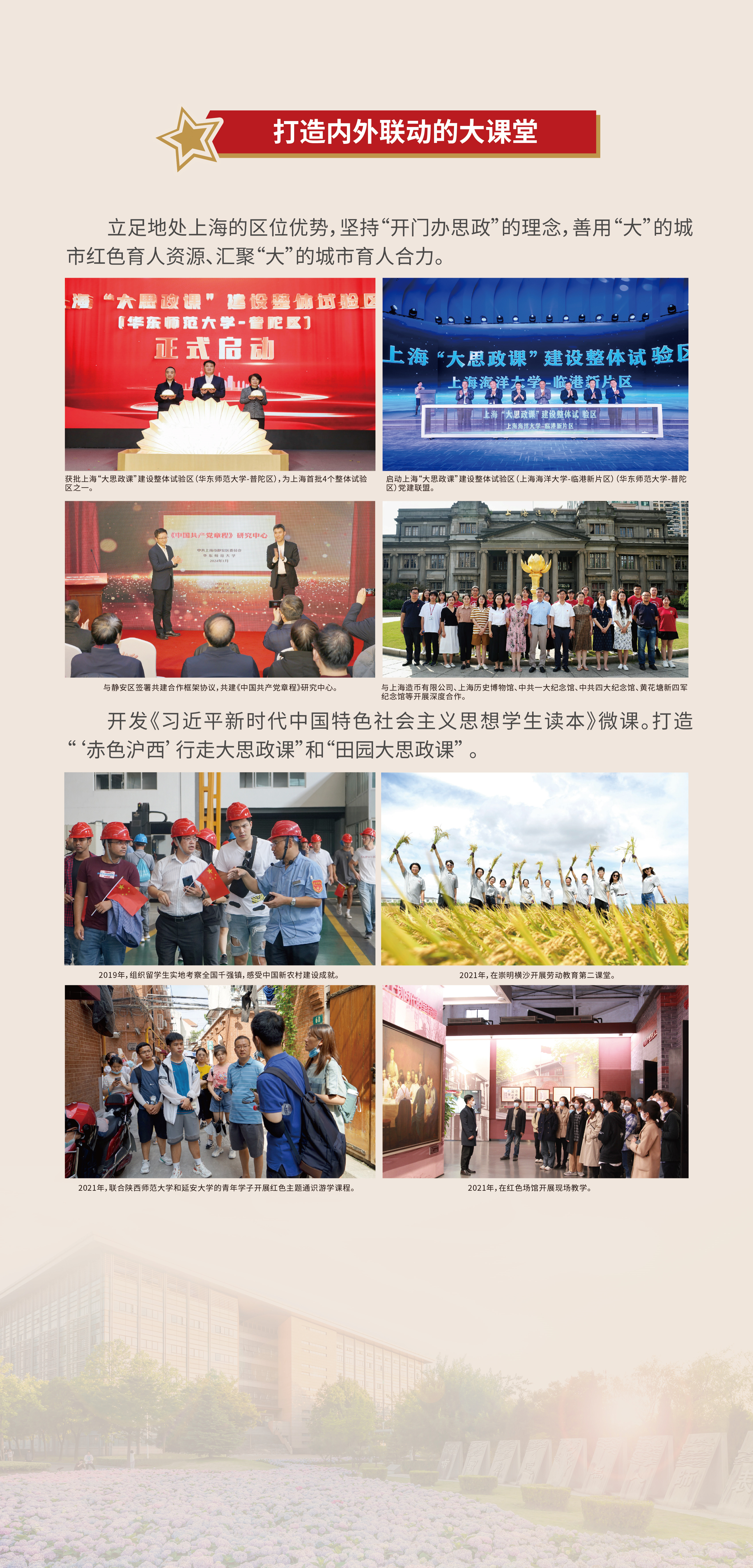 打造内外联动的大课堂。学校坚持“开门办思政”,积极将红色场馆、街道社区、区域化党建单位等社会资源转化为思政育人资源,搭建内外联动大思政课堂。作为上海市首批4个“大思政课”建设整体试验区之一,与中共一大纪念馆、林州市红旗渠纪念馆等4个教育部“大思政课”实践教学基地结对共建,与上海造币有限公司签署“大思政课”合作共建协议。与静安区签署共建合作框架协议,联手推进红色文化建设,共建《中国共产党章程》研究中心,与中共一大纪念馆、中共二大纪念馆、上海革命历史博物馆等场馆共建“大思政课”现场教学点,为上海建设习近平文化思想最佳实践地提供支撑。同时联合普陀区教育局开发《习近平新时代中国特色社会主义思想学生读本》微课、打造“‘赤色沪西’行走大思政课”和“田园大思政课”,让革命文物资料、城市发展成果等变成生动的“课本”。