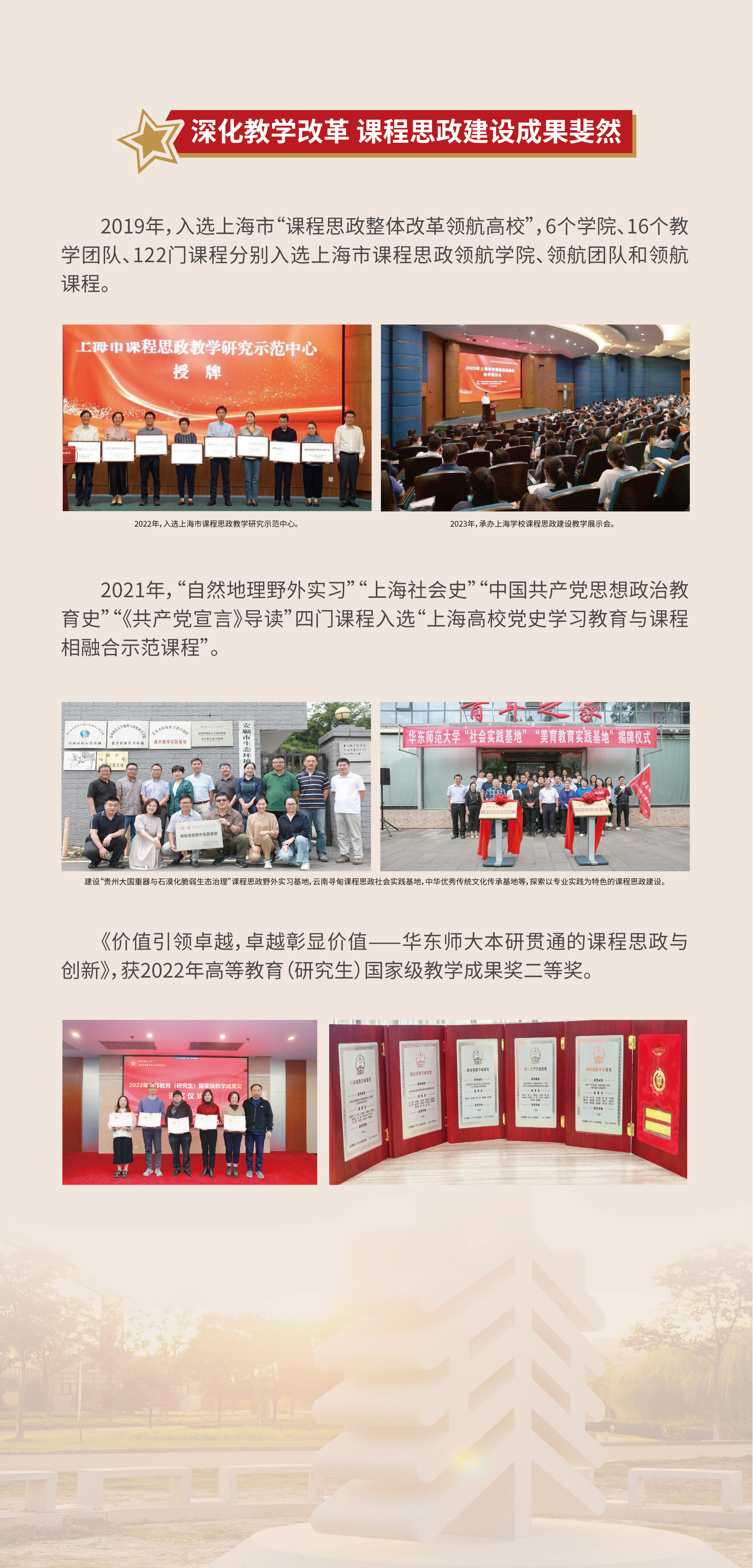 深化教学改革,课程思政建设成果斐然。目前,学校课程思政已覆盖所有类型课程,并入选首批教育部课程思政教学研究示范中心、上海市课程思政整体改革领航高校。五年来,学校4门课程及主讲团队入选首批教育部课程思政示范项目、39个项目入选上海市课程思政示范项目、4门课程获批上海高校党史学习教育与课程相融合示范课程、8位教师在首届上海市课程思政教学设计展示活动中斩获荣誉;策划组织“3245澳门新莆京课程思政研究丛书”,已出版、拟出版相关指南、案例集12本,承担教育部体育、地理教指委委托研制课程思政指南任务,10项课题获省部级课程思政支持、教师发表课程思政论文57篇,学校课程思政建设成果获2022年国家教学成果奖二等奖,为课程思政高质量发展提供有效支撑;同时承办上海学校课程思政建设教学展示会,通过示范带动课程思政不断走深走实。人民日报、新华社、光明日报、教育部网站等,对学校课程思政育人改革成效报道超百条。
