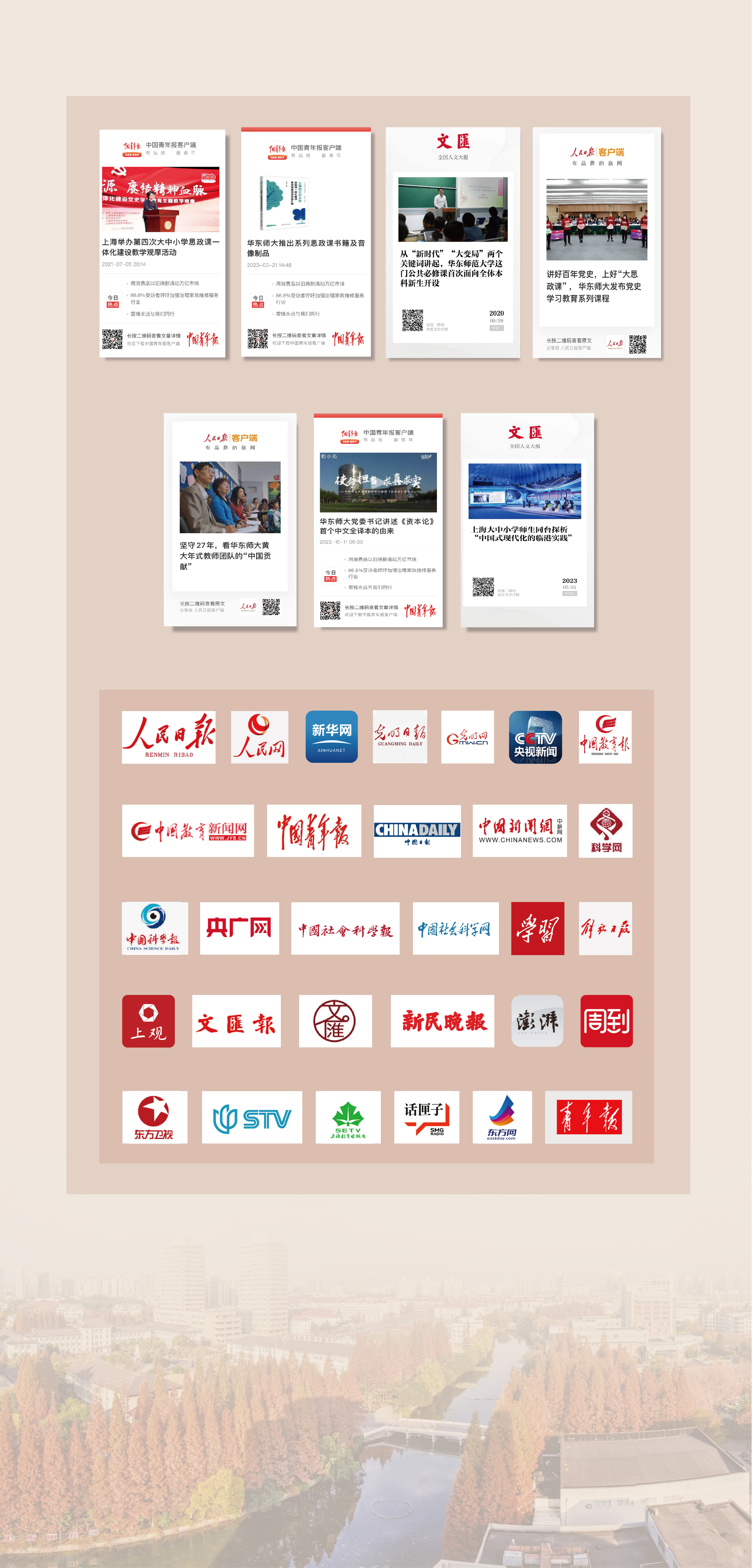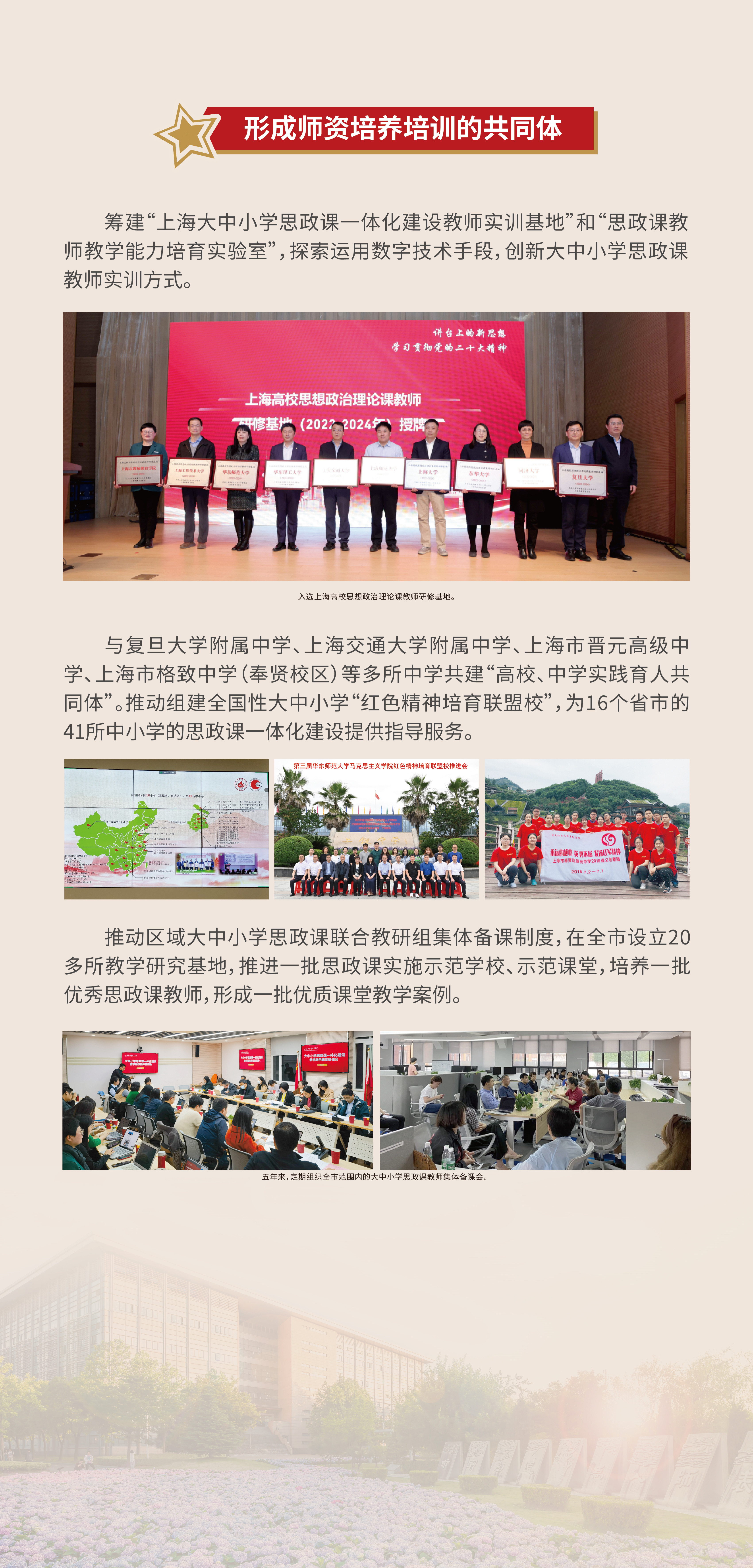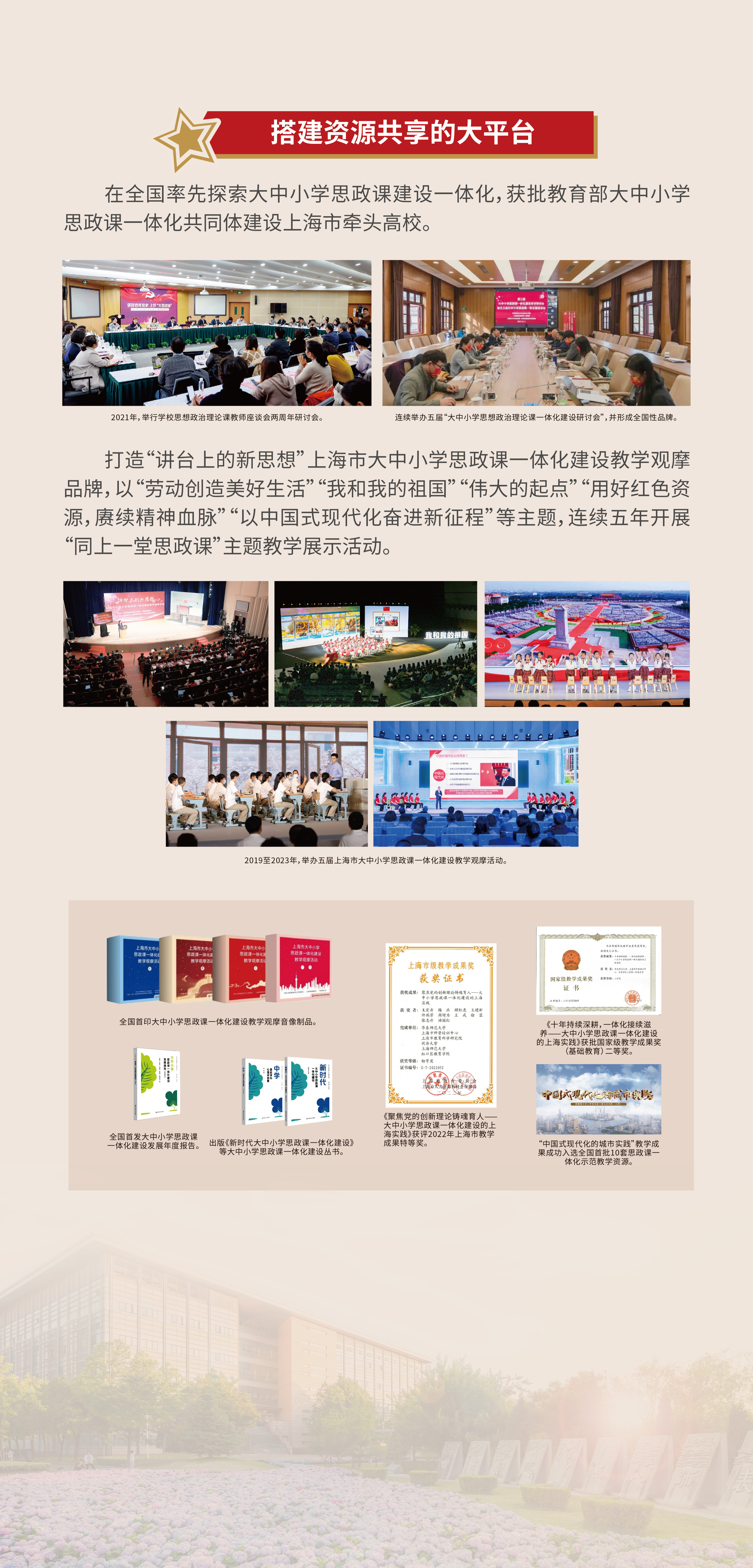 搭建资源共享的大平台。率先探索大中小学思政课一体化建设,获批教育部大中小学思政课一体化共同体上海市牵头高校;牵头申报“大思政课”建设整体试验区,入选上海首批4个整体试验区之一。连续五年举办“讲台上的新思想”上海市大中小学思政课一体化建设教学观摩系列活动,持续构建大中小学思政课“共学、共研、共教”教学观摩常态化工作机制,搭建“上海大中小学思政课一体化建设教师实训基地”“思政课教师教学能力培育实验室”等实践平台创新思政课教师实训方式,累计吸引近3000人现场参与、27万人次在线观摩,在全国形成突出示范效应的同时,先后荣获上海市教学成果特等奖、基础教育国家级教学成果二等奖。深入实施与学校附属中小学“大中小学思政课一体化建设教育集团”建设计划,推进与多区教育局一体化共建活动;在全市设立30多所教学研究基地,以项目驱动的方式,推动“师资培训、教学资源、教学模式”等优质资源的流通与共享;推动组建全国性大中小学“红色精神培育联盟校”,为16个省市的41所中小学的思政课一体化建设提供指导服务。在此基础上,学校还出版了全国首个大中小学思政课一体化建设教学观摩音像制品、《新时代大中小学思政课一体化建设》等大中小学思政课一体化建设丛书,发布国内首个《大中小学思政课一体化建设发展报告(2022)》等,为我国大中小学思政课一体化建设的纵深改革与创新发展提供了有益参考。