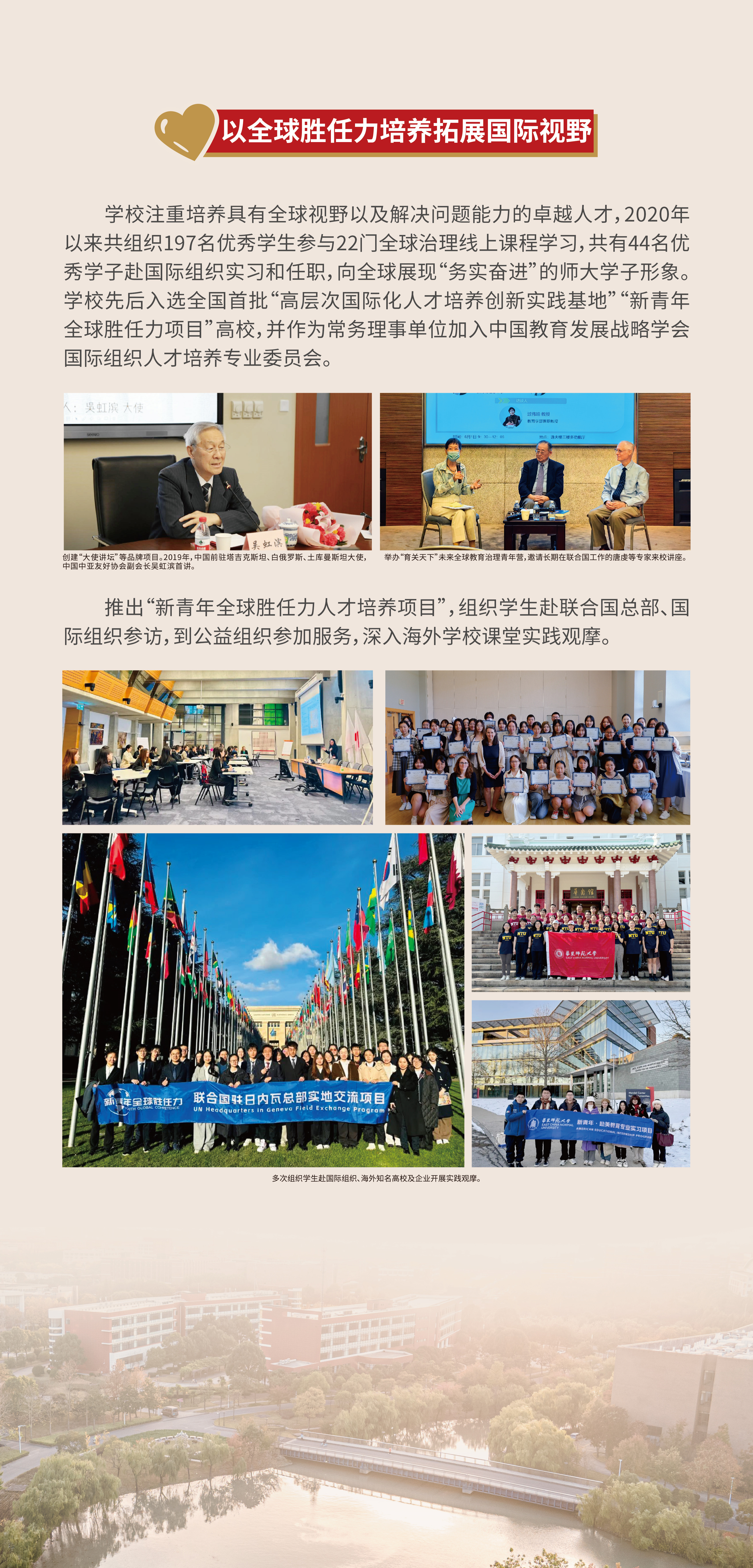 以社会担当涵育家国情怀。学校连续三年实施“教育筑梦”计划,支持奋斗在边远地区的基础教育校友实现教育梦,目前已惠及全国21个省、市、自治区的3万余名师生,入选教育部高校思想政治工作质量提升综合改革与精品建设项目。在实施寻甸中小学骨干教师工作坊研修基础上,实施“乡村教师”博爱成长行动,面向54个欠发达区县对2100余名小学教师开展教育帮扶。研究生支教团连续23年扎根云南武定一中,获中国青年志愿服务大赛银奖。打造“小我融入大我”实践育人“大课堂”,千余支大学生社会实践队伍接续奔赴全国各地、深入基层一线,开展乡村振兴、城市治理、教育扶贫等实践活动,鼓励引导青年学子主动投身国家发展需求。