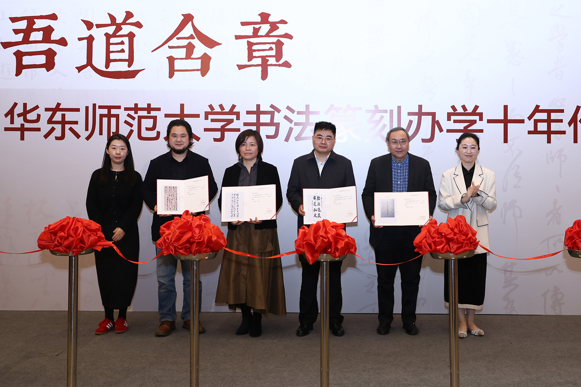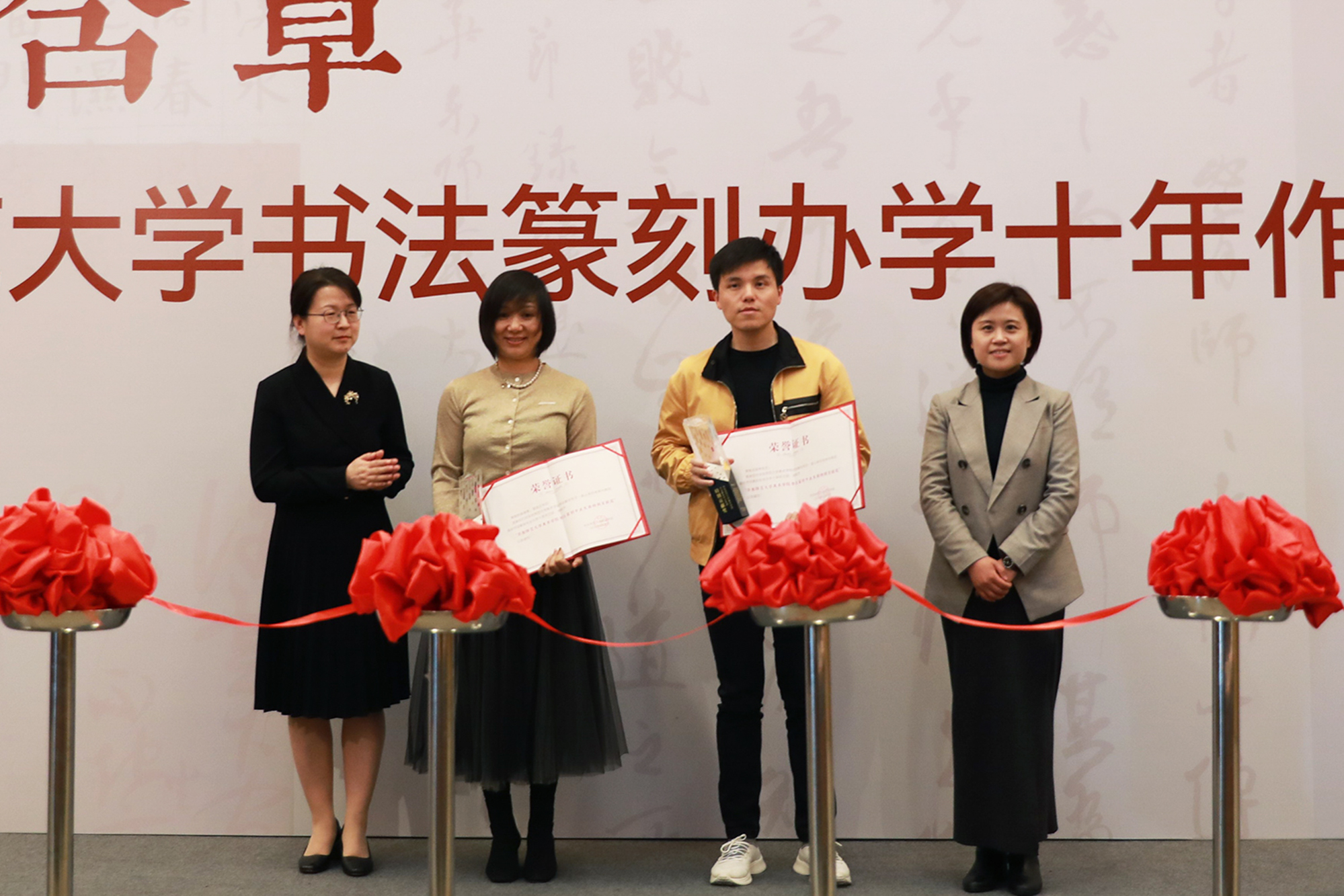 华东师大书法篆刻办学高速发展的十年离不开社会各界人士的关心和支持。华东师大党委宣传部常务副部长刘麒、美术学院党委书记卢蓓蓉为葛淑文女士、沈国林先生颁发“美术学院书法篆刻专业发展特别贡献奖”。