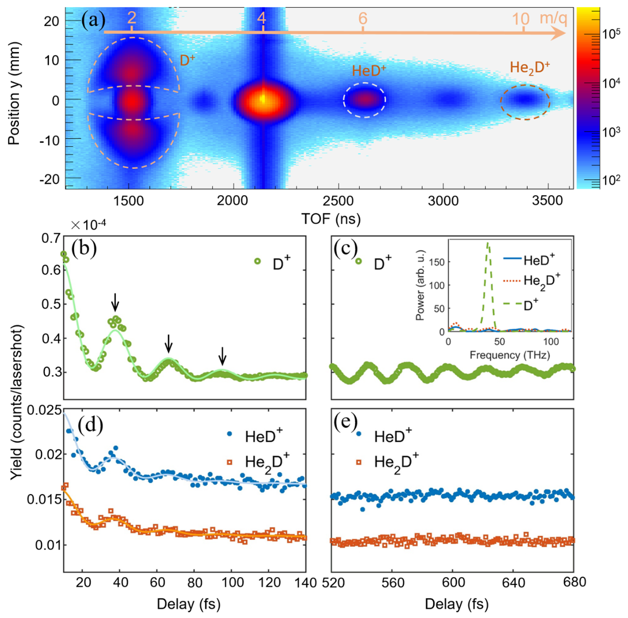 图3. 实验结果图。(a)实验测量到的离子产率随飞行时间(TOF)和位置(y方向)变化的二维图。(b),(c) 气相环境中的D2+离子振动波包随时间演化实验测量结果;(d),(e) 超流氦液滴体内D2+离子振动波包随时间演化实验测量结果
