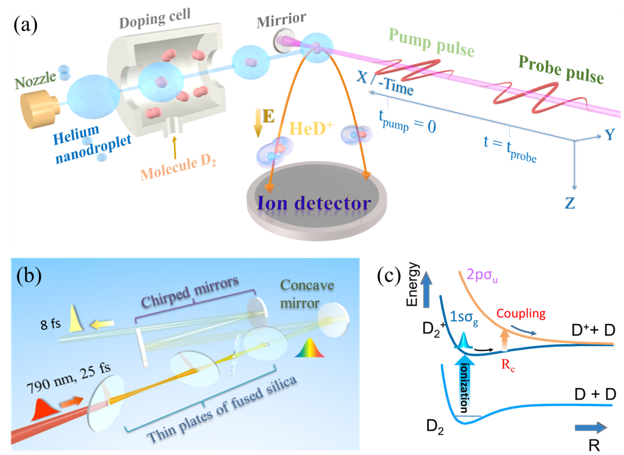 图2. 氦液滴中分子振动耗散动力学研究实验方案示意图。(a)氦纳米液滴分子动力学反应谱仪,(b) 少周期激光脉冲泵浦-探测实验装置示意,(c) D2+振动波包激发离示意图