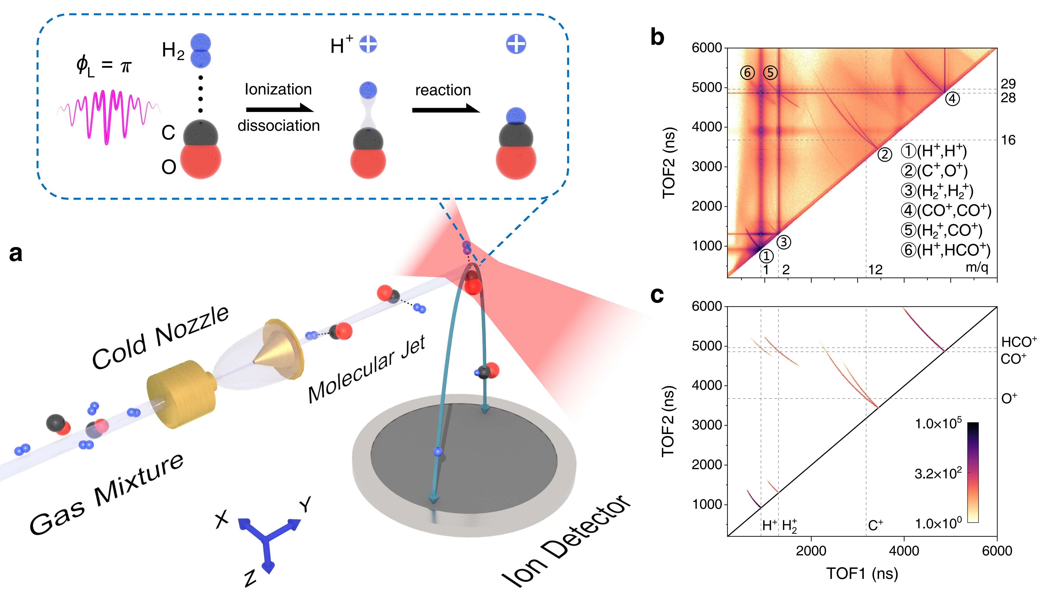 激光诱导无机双分子反应动力学实验探测。a实验装置示意图,b,c离子飞行时间符合谱图。