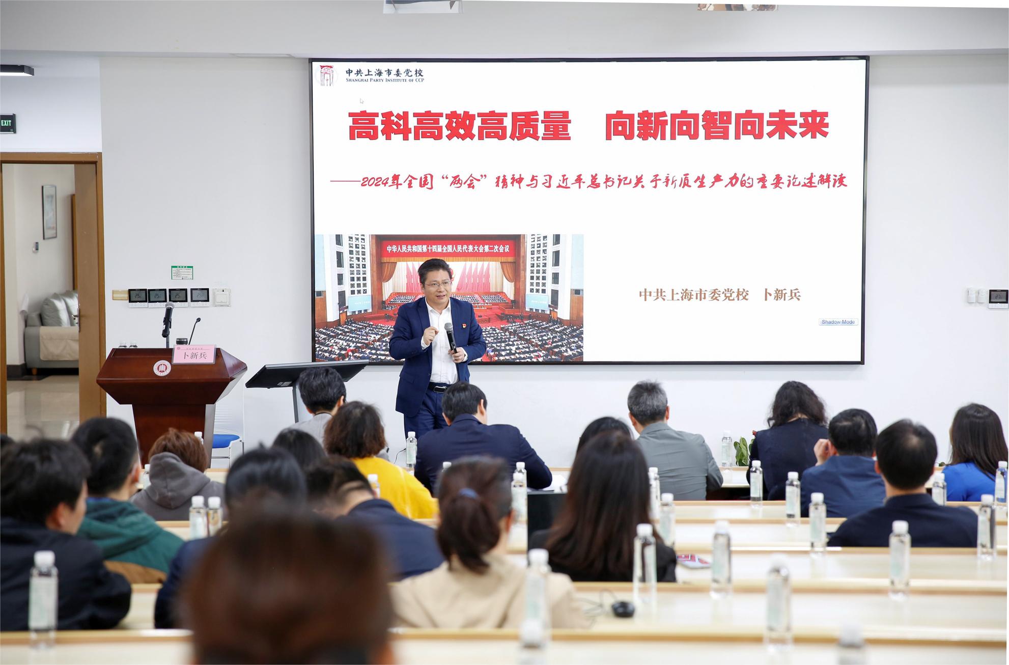卜新兵以《高科高效高质量 向新向智向未来——2024年全国两会与总书记关于新质生产力的重要论述解读》为题开展报告。他从新质生产力产生的背景出发,介绍了当今世界正处于百年未有之大变局,指出党中央要求全体党员干部具有的三大能力、三小能力和七大思维。接着他深刻剖析了新质生产力的内涵,将其概括为“高科高效高质量、向新向智向未来”,并且绘制了新质生产力关系图和新质生产力的理论公式,帮助学员直观理解新质生产力与高质量发展、全面建成社会主义强国等要素之间的关系。卜新兵强调,要在做好本职工作中,强化使命担当、增强政治执行力,特别是对于教育工作者,要深刻理解为什么要建设教育强国、什么是教育强国,以及怎样建设教育强国。最后,卜新兵提出在维护祖国统一问题上要敢于斗争,要为强国复兴作出华东师大应有的更大的贡献。
