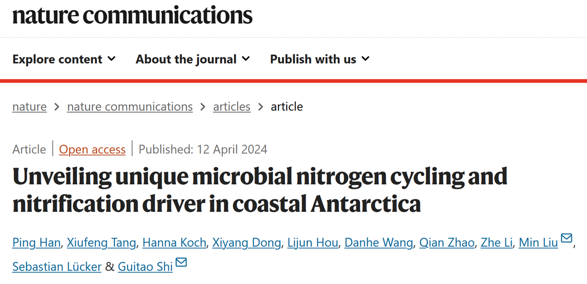 Han P, Tang X, Koch H, Dong X, Hou L, Wang D, Zhao Q, Li Z, Liu M*, Lücker S, Shi G*. Unveiling unique microbial nitrogen cycling and nitrification driver in coastal Antarctica. Nature Communications. 2024, 15(1):3143.https://rdcu.be/dEUTd