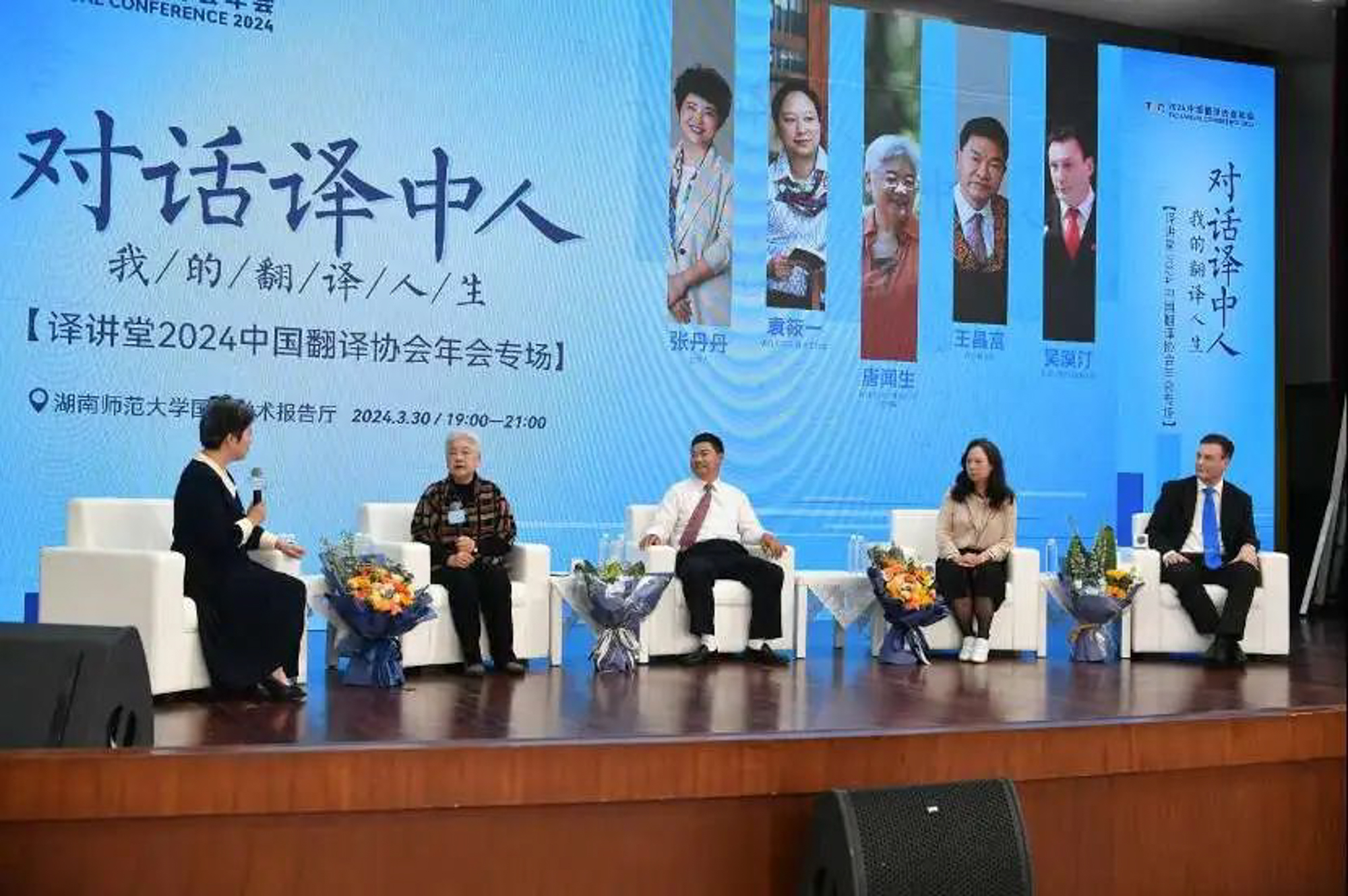 年会期间,袁筱一教授作为四位受访嘉宾之一,参加了由中国翻译协会主办、中国外文局翻译院与湖南师范大学外国语学院承办的“译讲堂”中国翻译协会年会专场活动——“对话译中人 我的翻译人生”。