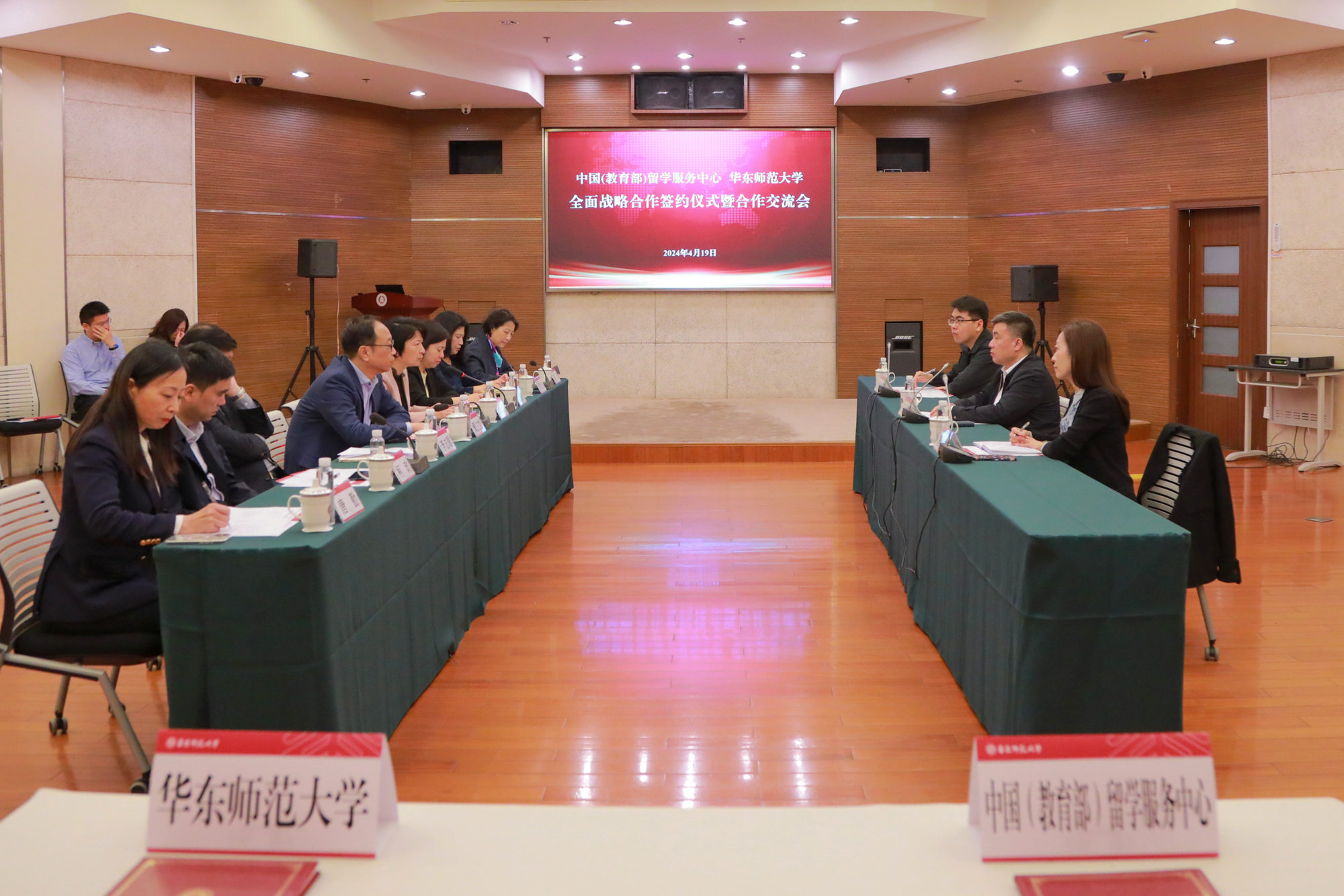 华东师大基础教育与终身教育发展部部长李志聪,国际汉语文化学院党委书记、国际教育中心主任黄美旭,开放教育学院(教师发展学院)党总支书记赵健等与教育部留学服务中心国际处副主任杨小婧等,就全面战略合作协议解读、来华留学、出国留学、学术交流、人才培养、国际合作模式创新开展了深入交流和探讨。