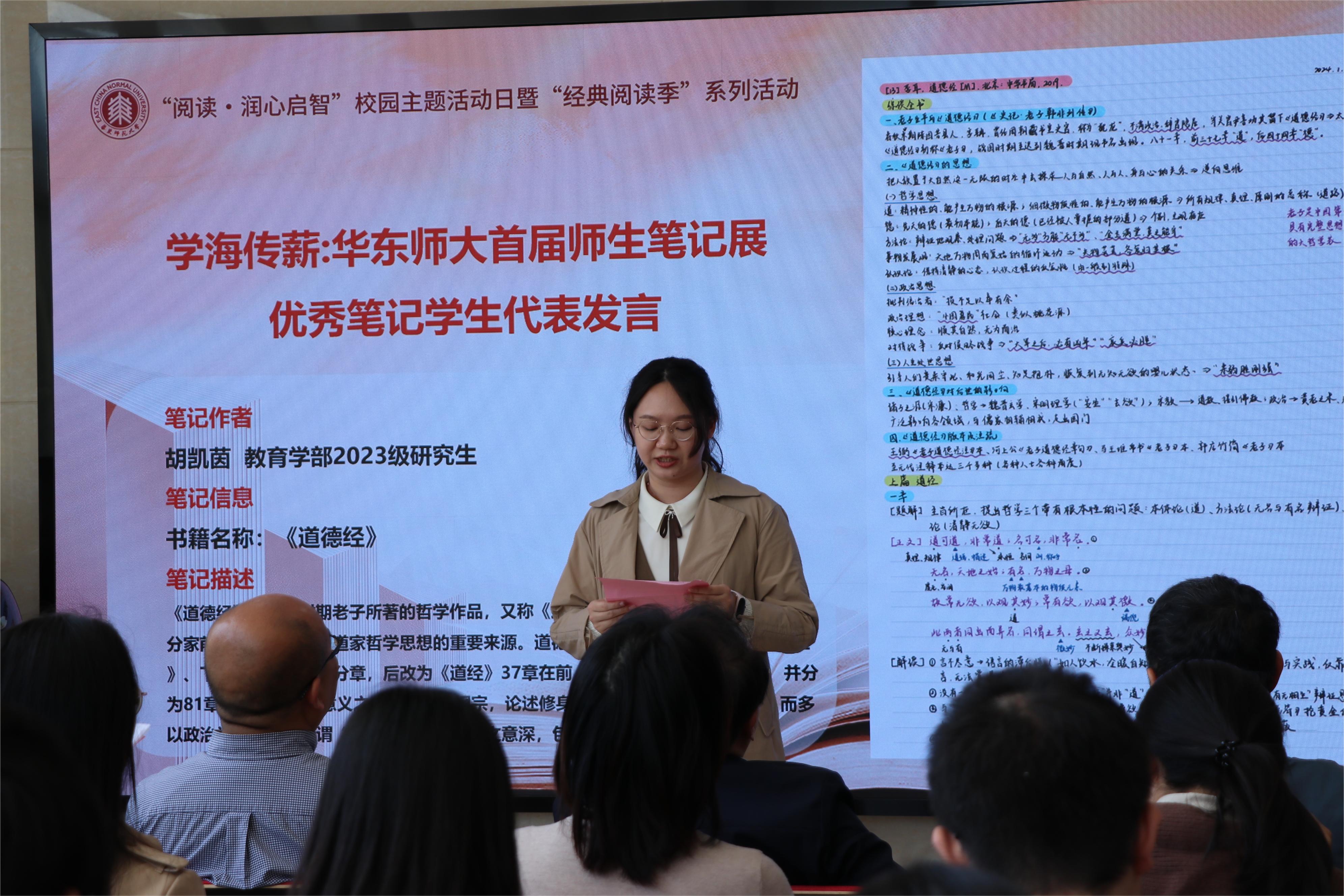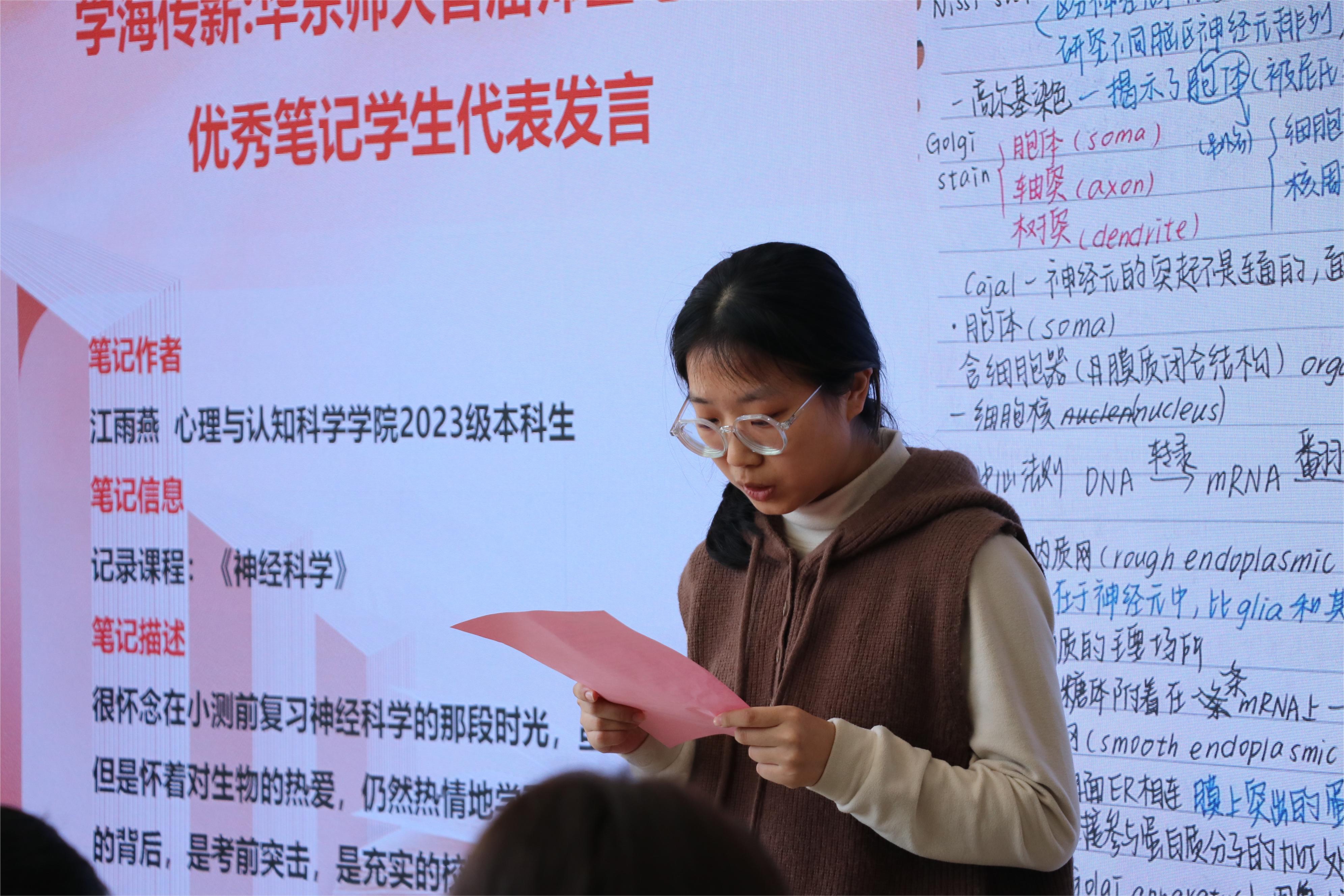 教育学部2023级研究生胡凯茵和心理与认知科学学院2023级本科生江雨燕作为优秀笔记作者代表发言。胡凯茵分享了做阅读笔记的经验:“在阅读的过程中,我会随手记录笔记,帮助自己捕捉那些稍纵即逝的论文写作灵感,每一次有意识记录都是对思维的锻炼。同时不要忽视注释等看似不起眼的部分,它们往往蕴含着作者的内容解读和思维支架,能够帮助我们更好地把握书中的精髓。”江雨燕分享了做课程笔记的经验:“笔记可以帮助我们加深对知识的理解,使知识在脑中形成体系化。记笔记的目的不是记录下别人的想法或观点,而是要借鉴别人的思想和做法,丰富我们自己的知识体系。”