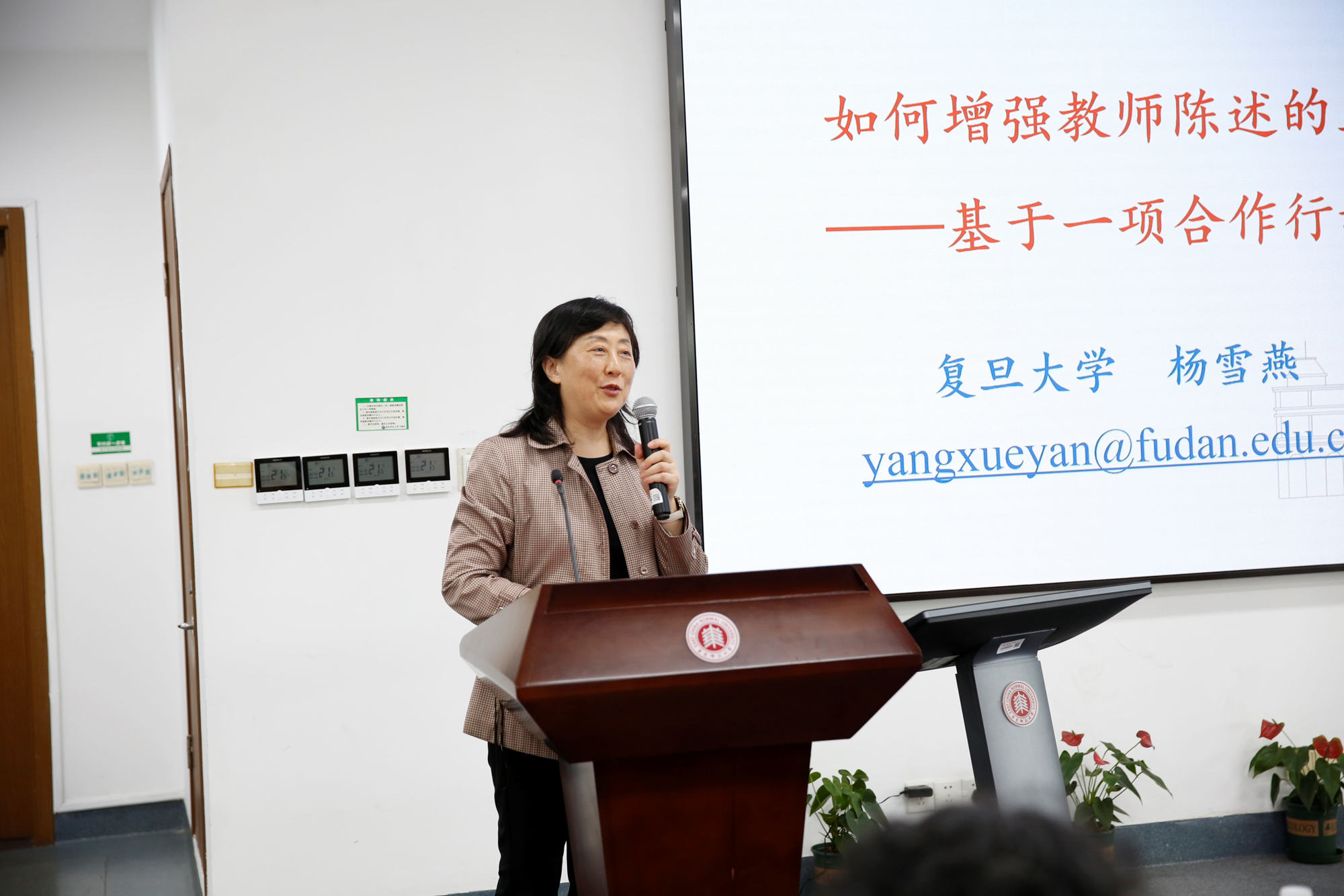 杨雪燕教授在报告“如何增强教师陈述的互动性——基于一项合作行动的研究”中从系统功能语言学视角出发,探讨一线英语教师在教育层面遇到的问题,并详细介绍了其所建构的“教师陈述”的互动模型。报告由上海电力大学潘卫民教授主持。
