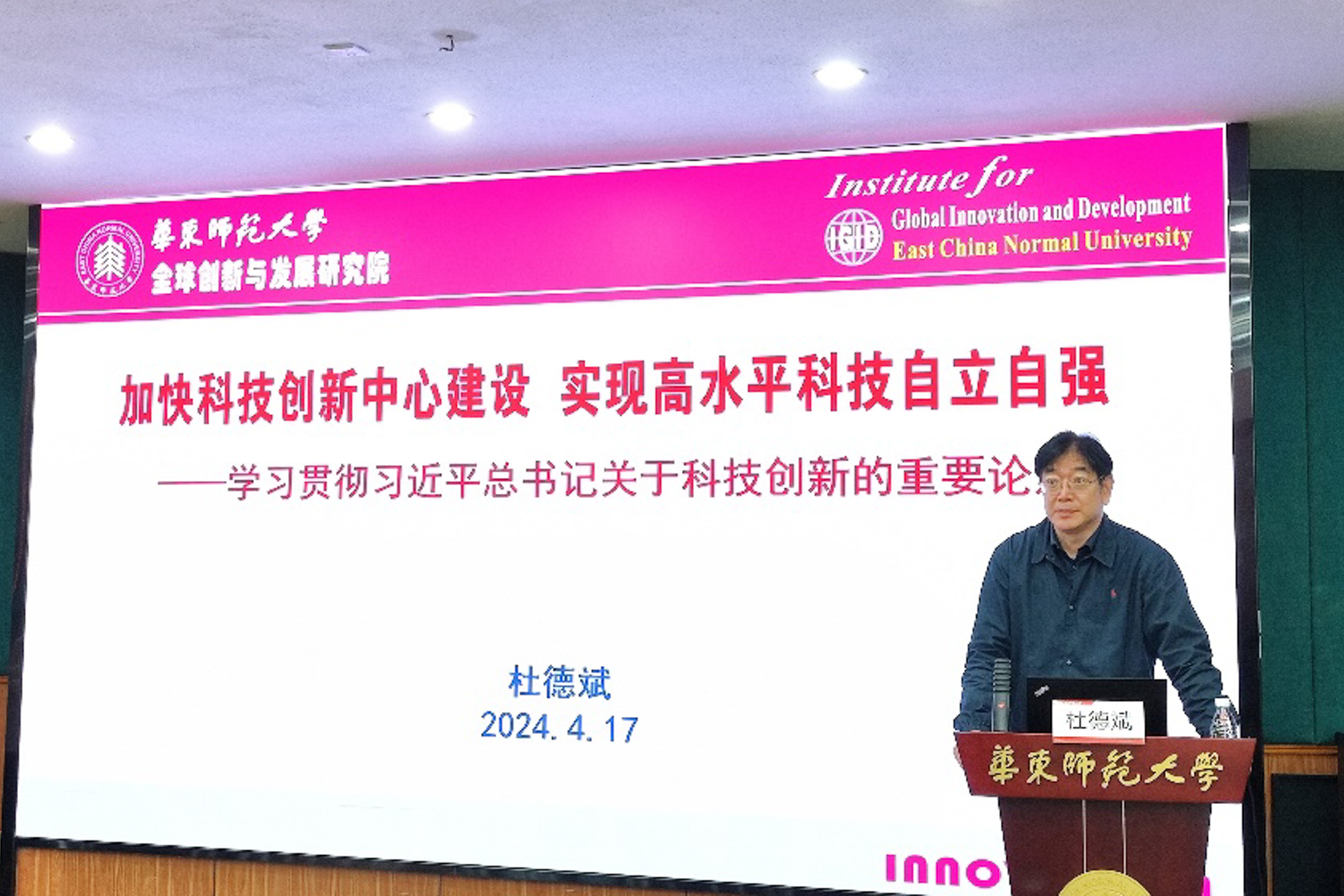4月17日下午,华东师大第20期青年骨干理论培训班在普陀校区孟刘馆二楼报告厅开展专题学习。我校全球创新与发展研究院院长、地理科学学院杜德斌教授以《加快科技创新中心建设 实现高水平科技自立自强》为题,带领青干班学员学习习近平总书记关于科技创新的重要论述。报告由青干班学员、外语学院原蓉洁副教授主持。