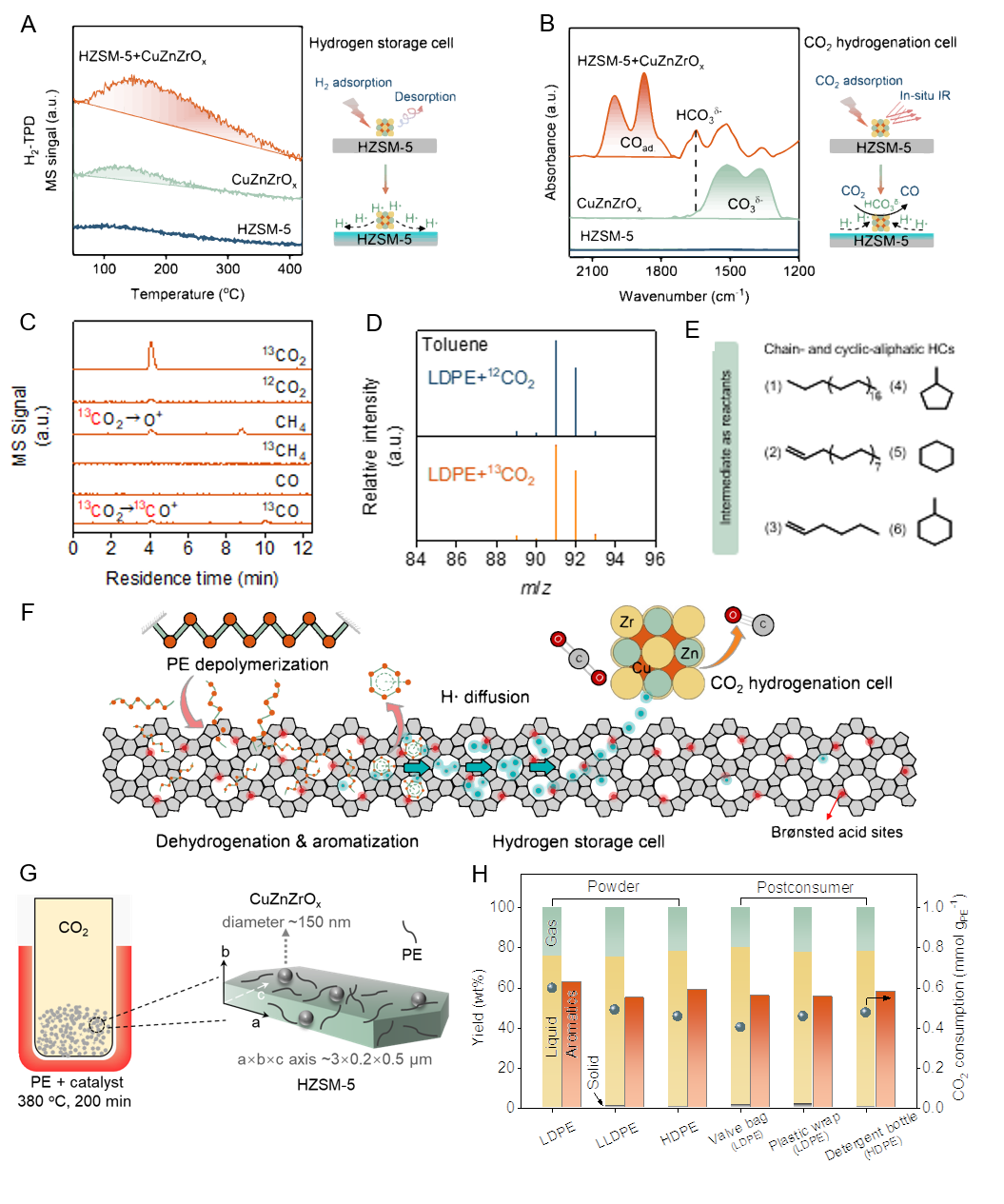 通过原位的氢气程序脱附、CO2原位吸附红外、13C同位素标记和模型反应物的验证,发现CO2通过原位消耗聚乙烯芳构化过程中产生的活性氢物种,有效的提高了芳烃的产率。并阐明了催化体系的构效关系,即HZSM-5充当“储氢池”,CuZnZrOx充当“CO2加氢池”的机制。
