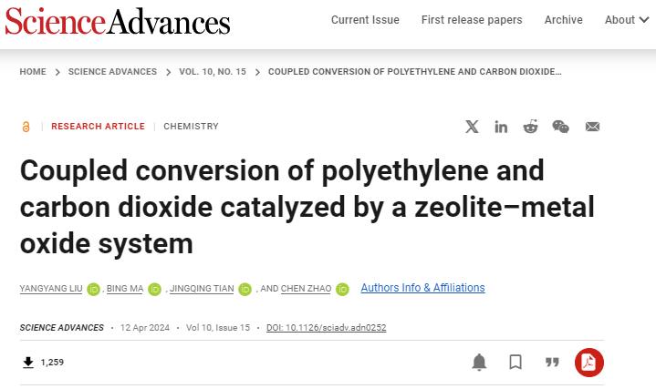 鉴于此,3245澳门新莆京化学与分子工程学院赵晨教授研究团队在废弃碳资源塑料和CO2的高价值利用上取得重要进展。构建了沸石-金属氧化物多相催化体系,通过芳构化-氢捕获机制耦合转化废弃聚乙烯与CO2为芳烃和CO。综合多种原位表征、同位标记、模型物的验证等手段,阐释了芳构化-氢捕获的反应机理。相关研究以 Coupled conversion of polyethylene and carbon dioxide catalyzed by a zeolite–metal oxide system 为题,于2024年4月12日发表于 Science Advances。