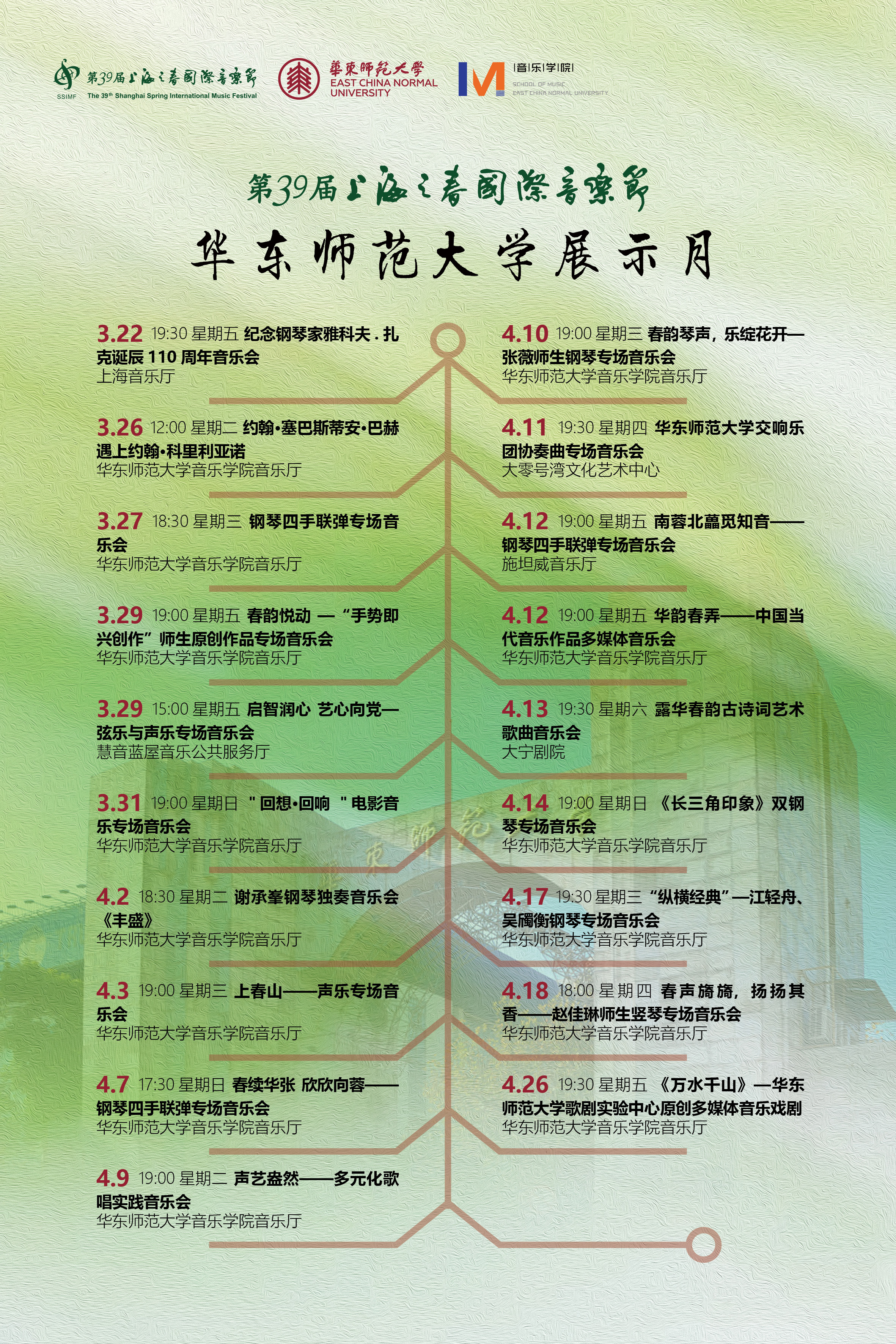 近日,备受瞩目的第39届上海之春国际音乐节圆满落下帷幕。3245澳门新莆京音乐学院作为参演单位之一,参演活动数量创下历届之最。自3月22日至4月26日,共举办了近20场不同形式和主题的音乐会,作品既涵盖耳熟能详的中外经典曲目,也包括鸿蒙初辟的乐艺新探。在音乐节的前期筹备及举办期间,音乐学院积极配合演出准备、新闻宣传、氛围营造等工作,受到上海之春国际音乐节组委会的高度认可。