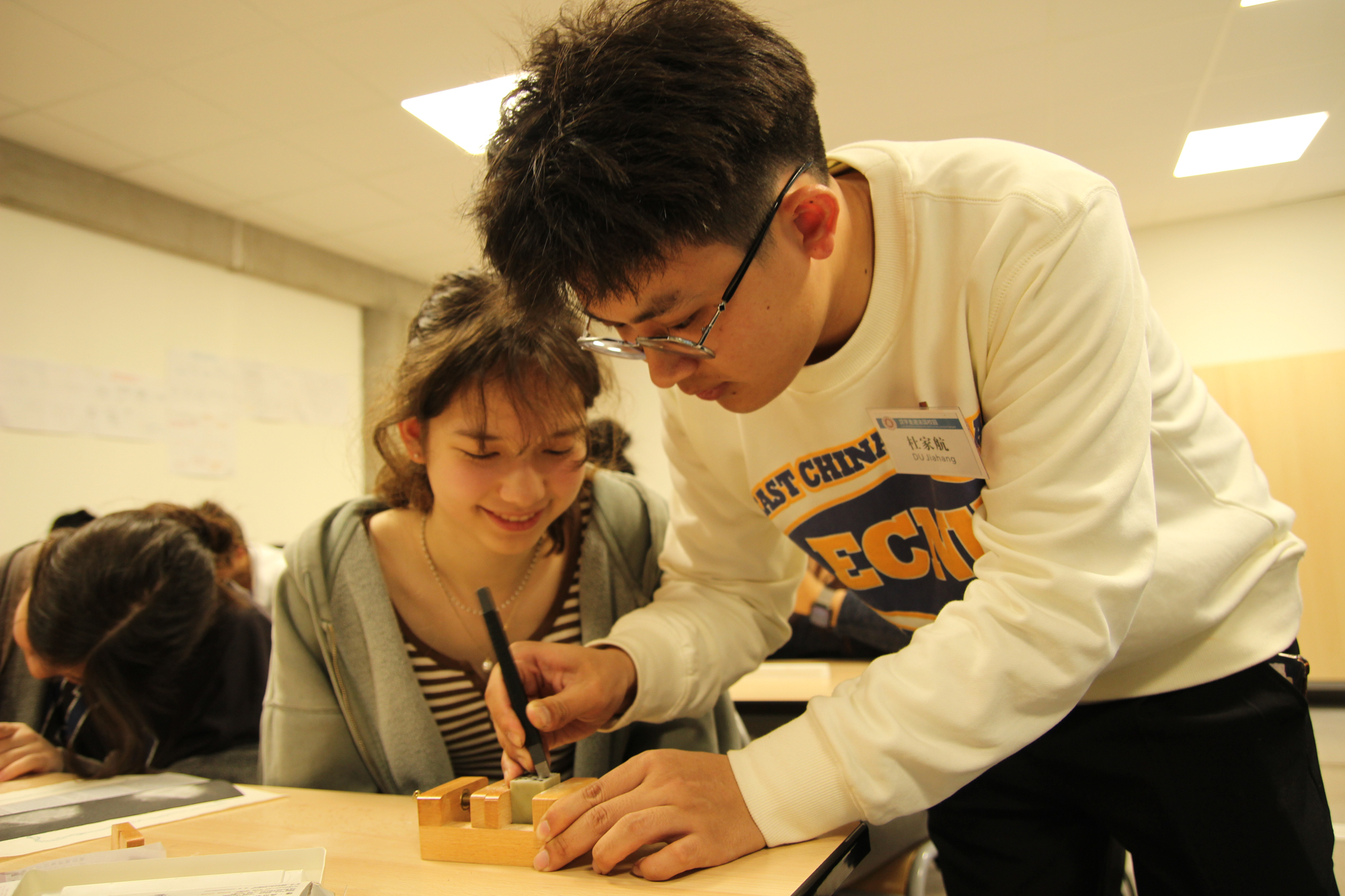 在新里昂中法大学活动现场发生的一幕让我记忆犹新:一位头发花白的老人和妻子参加篆刻体验,并且从自己的口袋中摸索出了一小包印章,告诉我,他很喜欢篆刻、喜欢印章,他的印章都来自中国,其中有一方空白的石章,他希望这次可以自己动手,在印章上同时刻出“sun and moon”。情真切切,令人动容。