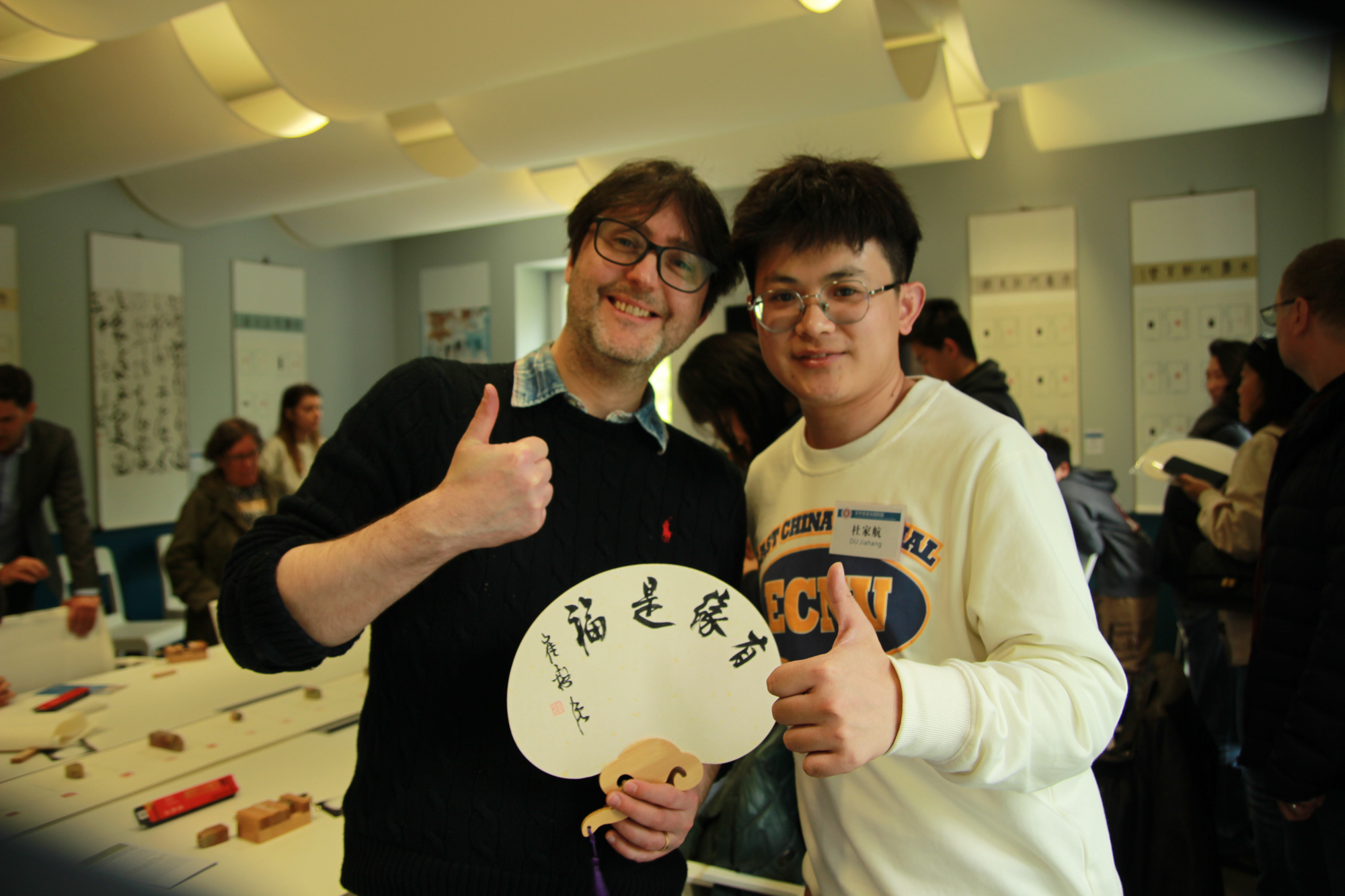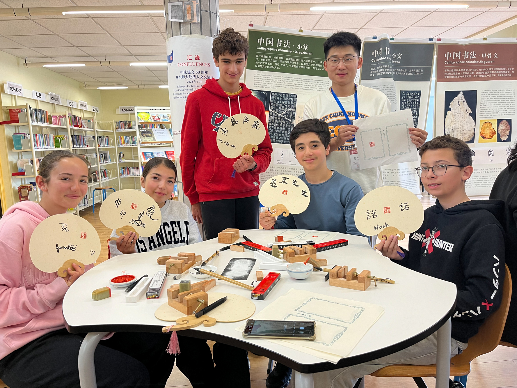 我们走访了法国五所大中小学,举行了多场书法篆刻体验活动……他们拿起毛笔,尝试书写“我爱你”“我爱我的朋友”“我爱中国”“我爱法国”等词句,展现出青少年们对于爱与友谊的热烈追求。