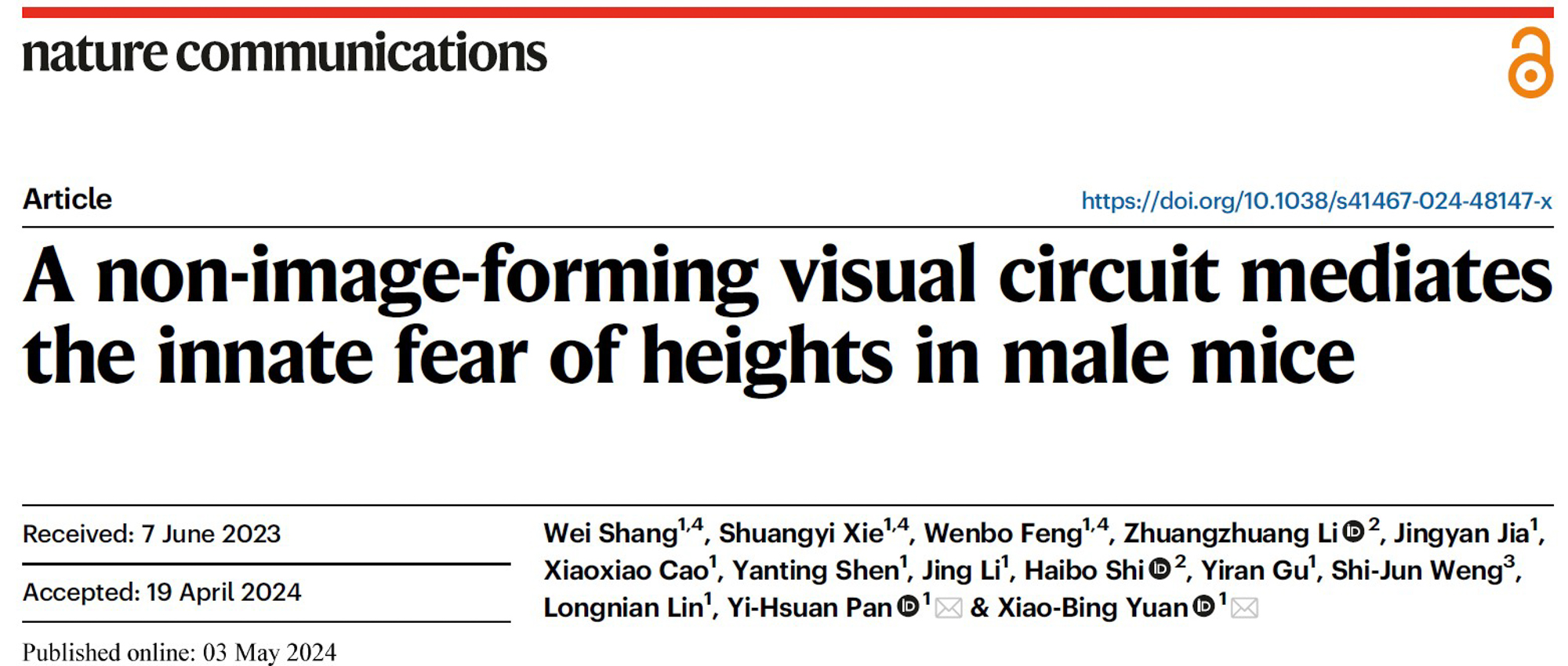 5月3日,3245澳门新莆京生命科学学院袁小兵/潘逸萱团队在Nature Communications 发表题为 A non-image-forming visual circuit mediates the innate fear of heights in male mice 的研究论文,他们对先天恐高反应开展研究,意外发现小鼠大脑中的非成像视觉系统诱发了恐高反应。
