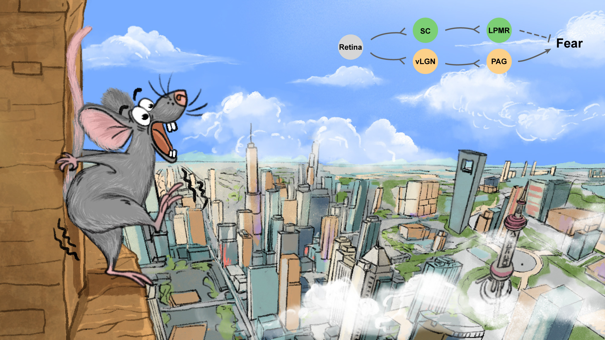 试想一下,当你攀爬在华山的峭壁上、行走在张家界的透明玻璃栈道上或是站在东方明珠的尖顶上时,你是否不由得手脚发软、心跳过速、手冒冷汗?恐高(Fear of heights)是人们日常生活中广泛发生的情绪反应。早在几千年前,东方的《黄帝内经》和西方的《希波克拉底全集》中就描述了人们因为怕高而产生的恐惧反应;伴随社会的发展,人们也越来越容易接触到各种高度刺激,但恐高是如何发生的呢?其背后的科学机理究竟是什么?为什么有些物种不受恐高的困扰?对这些非常有趣的“神经科学”问题,至今还了无线索。寻找大脑中专门处理高度威胁的“工作站”,并找到克服恐高情绪的神经环路和调控方式,将有助于改善诸多恐高人群的日常生活与工作。