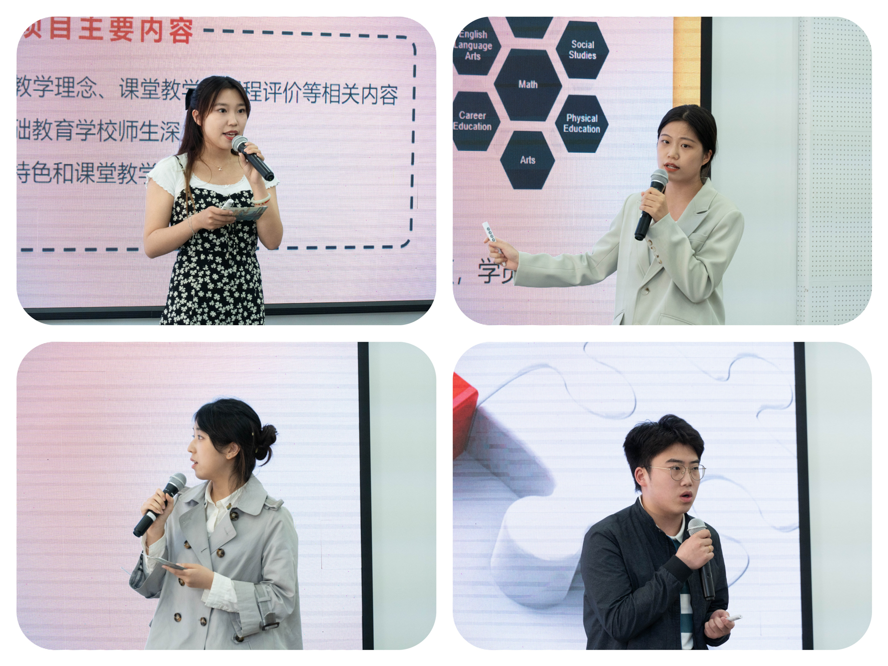 在项目内容分享环节,项目成员从多个方面介绍了UBC研修项目的整体情况。数学与应用数学专业王哲然从项目发展历程、学习内容等方面对项目进行了讲解。访学期间,她深刻领悟到不同文化背景下教育理念的差异,洞悉了全球教育领域前沿,对教育的多元化、复杂化有了更为深入的理解。物理学专业陈佳妮以基于理解为先教学设计(UbD)为核心,从教学模式、创新教学策略、课程评价、课程反馈概括了学习内容,并介绍了社会情感学习(SEL)课程。美术学专业周羽婷从“3C”——“温暖、创新、能力”三方面概述了加拿大基础教育学校的特点,在实地参访后收获了加拿大创新的课堂互动模式与校园环创思路,有助于迁移赋能至更多的教学策略中。地理科学专业孙智豪比较了不列颠哥伦比亚省(BC省)和我国基础教育课程,分享了BC省在课程改革和课标制定方面的经验,更深入理解了我国的教育改革。