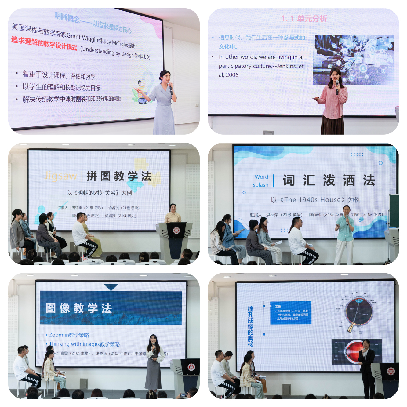 在学习成果展示环节,不同学科组的师范生选取某一教学方法、策略为切入点,立足本土基础教育实际、结合加拿大的教学理念开展模拟教学,为现场师生带来沉浸式的教学场景体验。汉语言文学专业魏子昕和柳正舞在UbD理论指导下开展高中语文单元教学说课,该理论为语文教学提供了新的生长点和可能性。思想政治教育专业周轩宇进行了拼图教学法的模拟授课,以郑和下西洋的教学内容为例,通过小组的拆散和重组,推动学生开展自主学习、合作学习、探究学习。生命科学专业秦雯和物理学专业于佩鹭以跨学科融合进行了图像教学法的模拟授课,这一教学方法增添了课堂乐趣,引发了学生的探究欲。英语专业洪林荣介绍了词汇泼洒法在英语学科教学中的应用,在备课过程中,她用“泼洒”一词形容这一教学方法,即经过教师的引导,学生会自主深度学习,延展思维的广度。