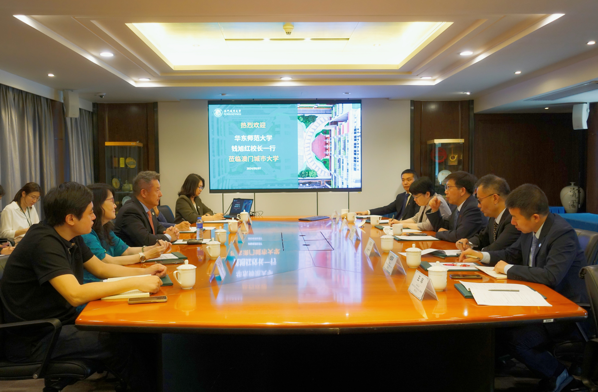 代表团随后访问了澳门城市大学。受华东师大校友、该校校长刘骏邀请,校长钱旭红向该校师生作《老子思维》报告,得到了在场师生的热烈回应和高度共鸣。代表团一行还与校长刘骏、人文社会科学学院院长金立贤、大健康学院学术领头人孙沛、教育学院课程主任彭俊、校长办公室主任谢嘉仪等座谈交流,共同推进落实共建葡语国家(地区)国际中文教育人才培育基地具体路径,并期待在大健康、智能金融、城市研究和发展等跨学科领域拓展新合作。座谈后,钱旭红一行参观了该校“中国-葡萄牙文化遗产保护科学‘一带一路’联合实验室”。