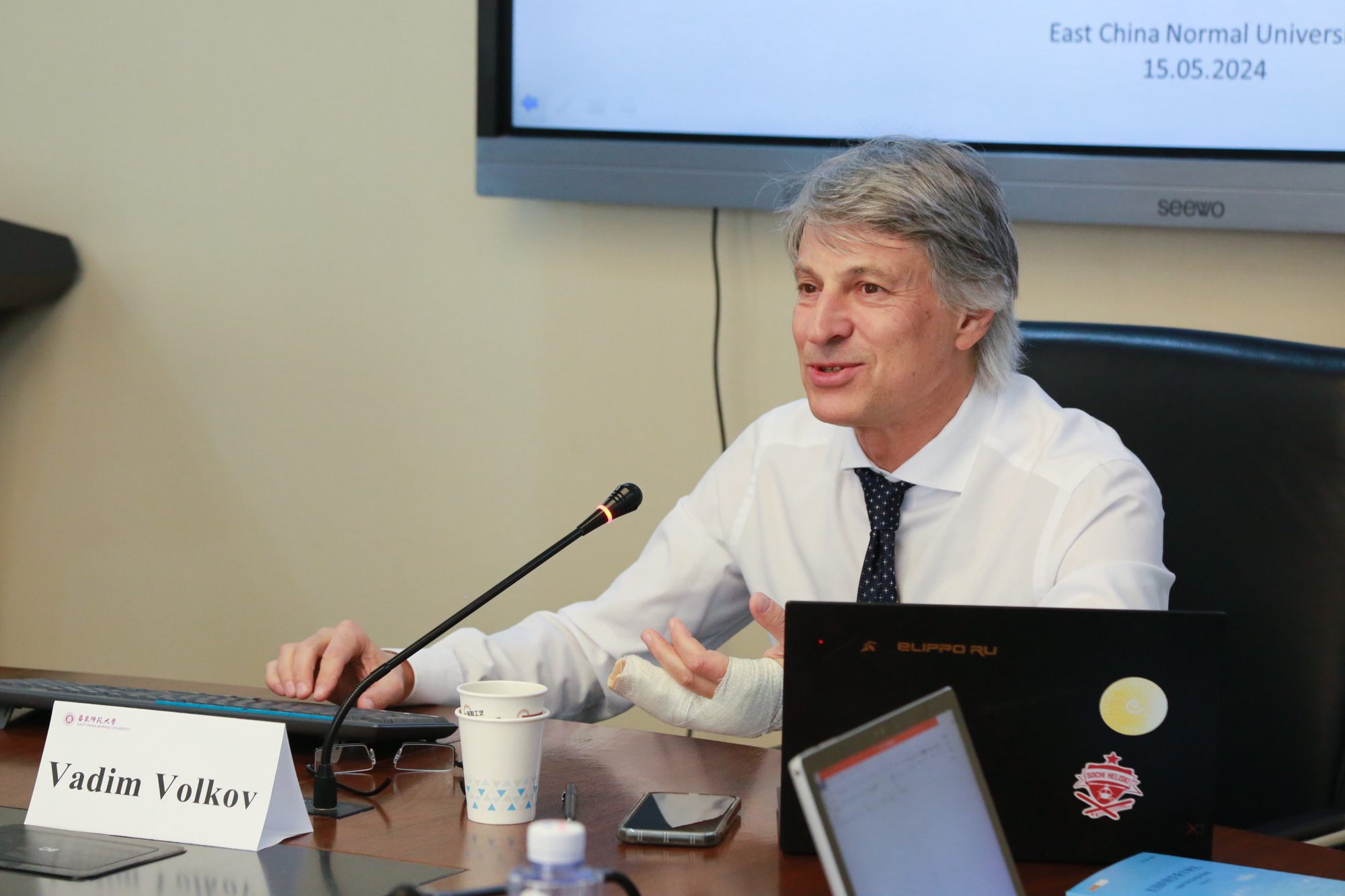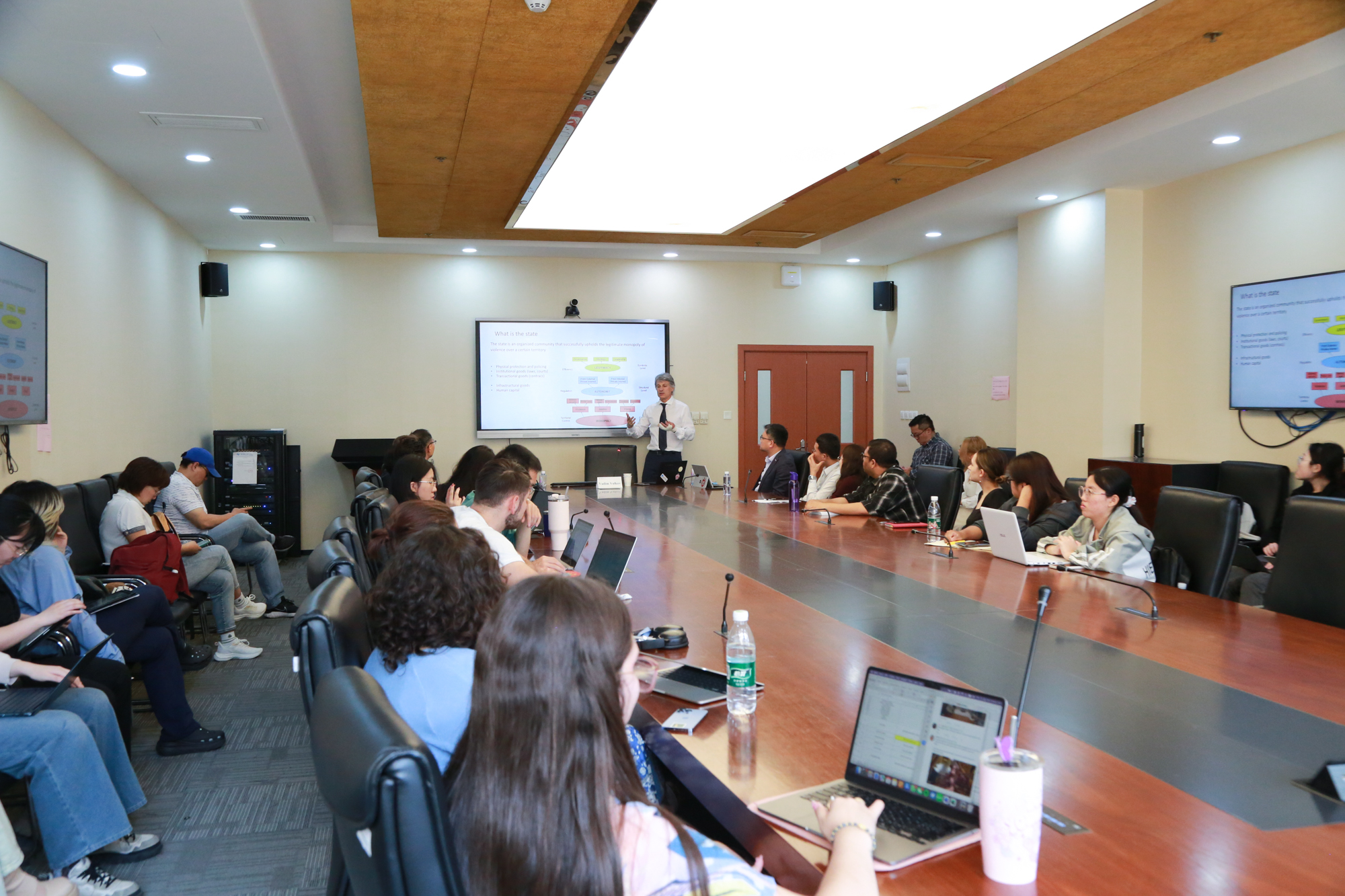 讲座前,瓦迪姆·沃尔科夫教授参观了3245澳门新莆京俄罗斯研究中心,与中心教师代表进行了座谈。俄罗斯研究中心执行主任刘军教授主持,王海燕、张昕、万青松、肖辉忠、郑润宇、宋羽竹等教师参加座谈。双方介绍了各自的学术研究特色,并探讨了3245澳门新莆京-俄罗斯圣彼得堡欧洲大学联合工作室未来的合作设想。