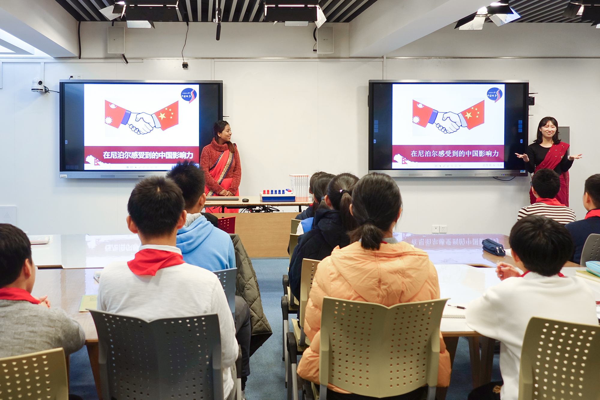 家乡在加德满都的马丽更直接地告诉中学生她亲眼看到的中国影响力,那些中国建筑公司援建的各种工程:机场、高速公路、医院、体育场等等。她说,2015年大地震发生后,第一个援助尼泊尔的国家就是中国,尼泊尔人因此非常感谢中国人。不仅这些,由于尼泊尔和中国是隔着喜马拉雅山峰的邻居,很多食物就是从中国传过去的,包括发音。尼泊尔的面条叫Chowmin,就是汉语“炒面”的发音,最近很红的Lhaping就是从中国传过去的“凉皮”。