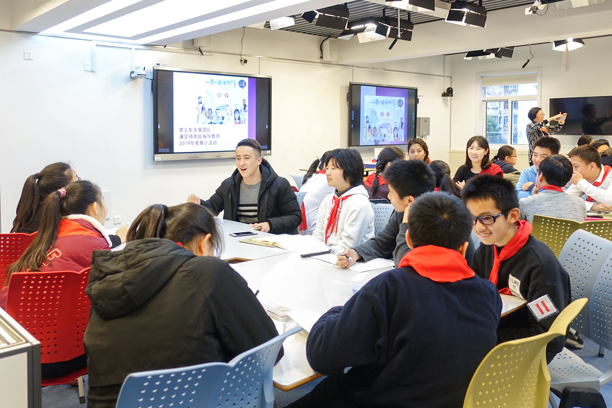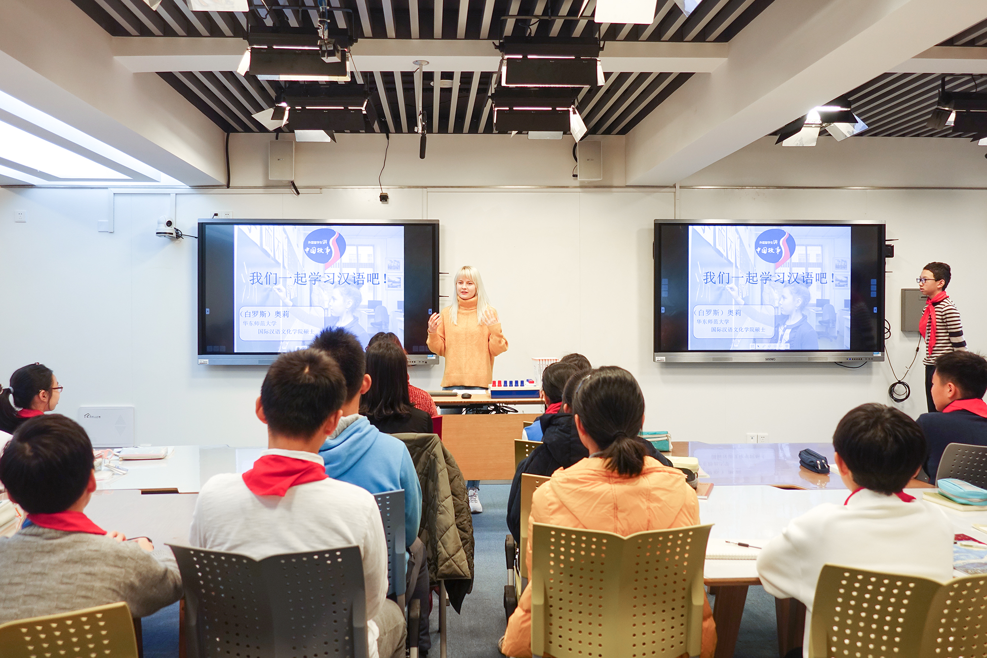 日前,一堂特别的“一带一路与我们”专题活动课在上海江宁学校石泉校区展开。上课的不是中国老师,而是6位来自华东师大国际汉语文化学院的外国留学生,他们受邀为七年级学生开设了这门特别的专题活动课。这是该校第二次邀请华东师大的留学生们走进学校走上讲台,来自一带一路沿线塔吉克斯坦、白罗斯、韩国、尼泊尔、泰国和蒙古6个国家的6位留学生围绕4个主题讲述了一带一路的故事。同时,这也是华东师大2019年文化建设项目“外国留学生讲中国故事”的系列活动。