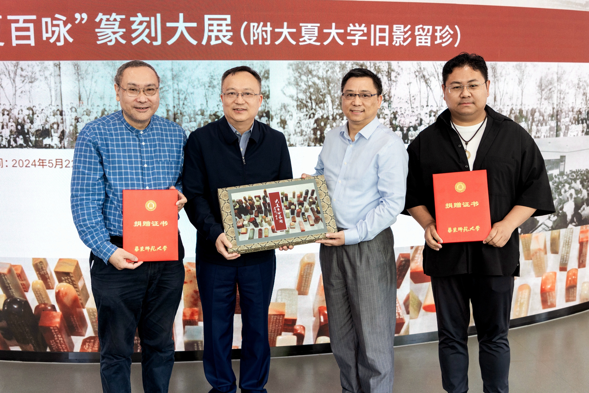 在上海书协副主席、华东师大书法系主任、篆刻基地负责人张索教授的精心指导下,经过大夏印社的周密组织,历时半年的辛勤筹备,此次展览得以和观众见面。这些珍贵的校史资料将长期在校园内陈列保存,成为华东师大人共同传承和发扬大夏大学精神的重要载体。现场,张索教授和大夏印社总干事许耕硕校友向学校捐赠“大夏百咏”篆刻百方作品,档案馆馆长汤涛接受捐赠,副校长雷启立颁发证书。
