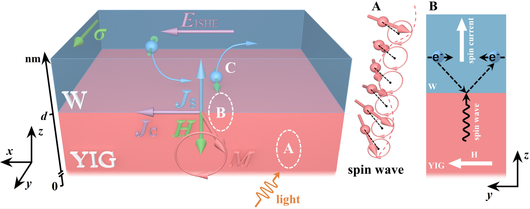 结果显示,SPVE随着YIG的厚度增加而增强。基于这一现象,团队对SPVE的微观机制提出了新的解释:首先,对器件施加光照时,YIG中的单个自旋受到光子的扰动,偏离其平衡状态。由于该自旋与相邻自旋之间的相互作用,光子引起的微扰在整个系统中传播并形成YIG中的自旋波。其次,在W/YIG界面处,自旋角动量从自旋进动(自旋波)转移到传导电子的自旋,即在W层形成电子自旋流。最后,W层中的自旋流通过逆自旋霍尔效应转换为逆自旋霍尔电压而被检测。图3展示了SPVE的物理机制示意图。该研究可为光生自旋流原型器件的设计提供理论参考。