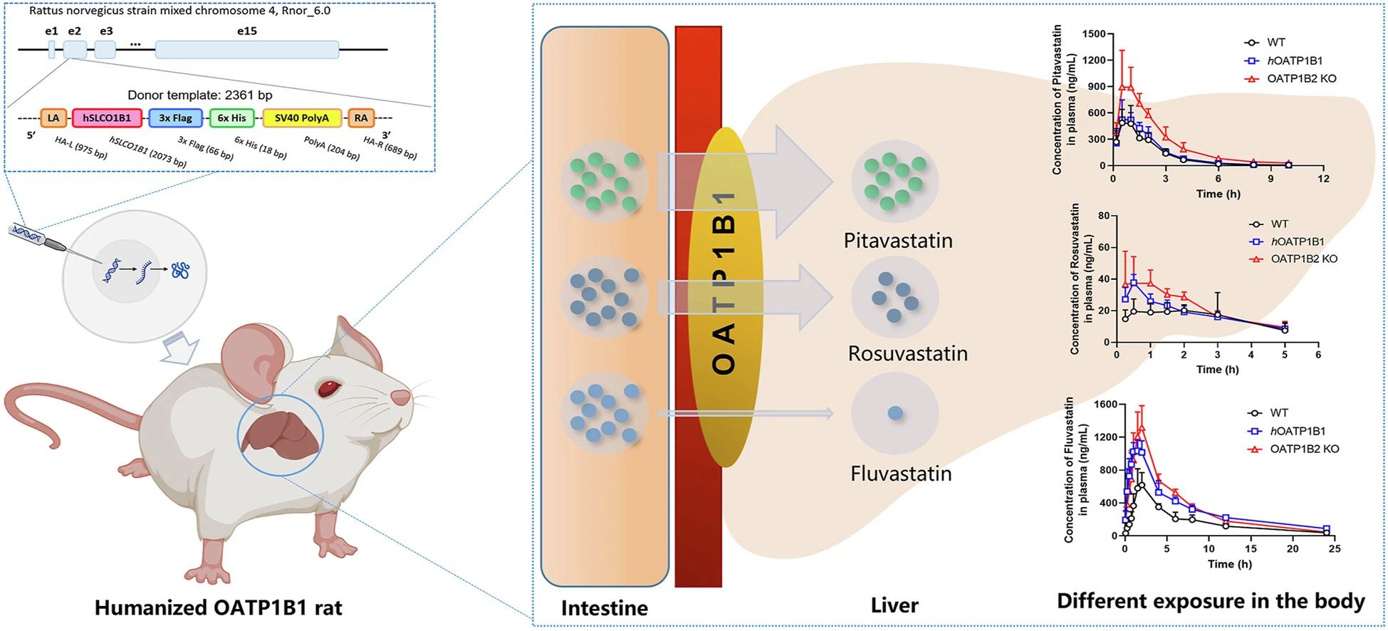 设计和构建人源化动物模型,尤其是人源化大鼠代谢模型在药理与毒理研究领域具有重要价值。为此,生命科学学院王昕教授团队使用CRISPR基因编辑技术成功构建了OATP1B1人源化大鼠,并评估了OATP1B1对匹伐他汀、瑞舒伐他汀和氟伐他汀的摄取转运功能。该人源化大鼠模型为研究OATP1B1的转运功能及其介导的药物相互作用提供了新模型与新方法。