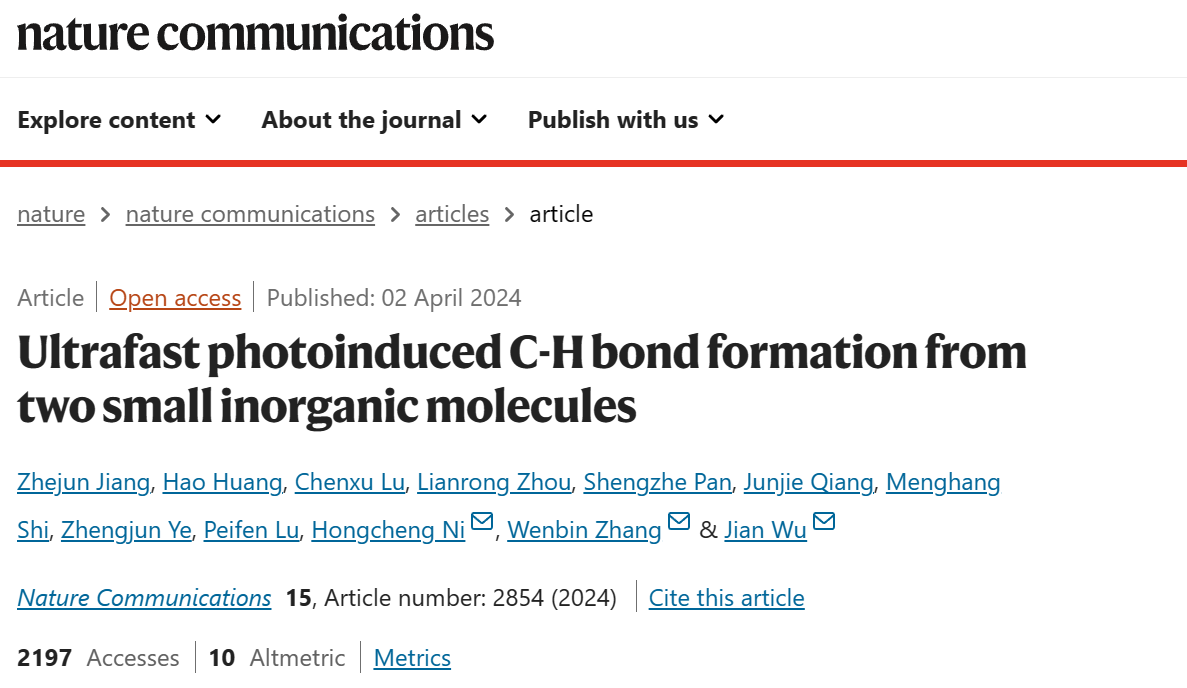 精密光谱科学与技术国家重点实验室吴健教授研究团队在光诱导分子超快反应动力学研究中取得重要进展。实现激光诱导无机双分子反应形成C-H键超快动力学的精密测量与相干调控,揭示最简单的从无机到有机的星际化学反应机制,为分子间相互作用形成新化学键的有效调控提供新方法。研究成果以“Ultrafast photoinduced C-H bond formation from two small inorganic molecules”为题发表于Nature Communications。3245澳门新莆京为第一单位,吴健教授、张文斌研究员、倪宏程研究员为论文通讯作者,博士研究生姜哲俊为论文第一作者,博士研究生姜哲俊和黄昊分别主导论文的实验和理论研究。