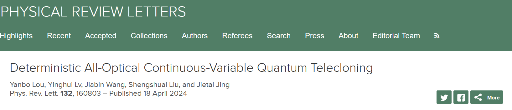 在量子信息领域,借助量子纠缠态实现的量子态远程克隆协议是重要的量子信息协议之一。精密光谱科学与技术国家重点实验室荆杰泰教授研究团队利用高增益低噪声的光学参量放大器和光学分束器网络在实验上成功实现了全光学的量子态远程克隆协议。实验结果表明,通过全光量子态远程克隆协议,两个在空间上分离的用户同时实现了对初始量子态的克隆,并且克隆保真度超过了相应的经典极限。此外,该协议可实现宽带量子态远程克隆,展示了该体系的高容量优势。该研究成果发表在Physical Review Letters,共同第一作者为娄彦博研究员和博士研究生吕颖慧,通讯作者为刘胜帅研究员和荆杰泰教授。
