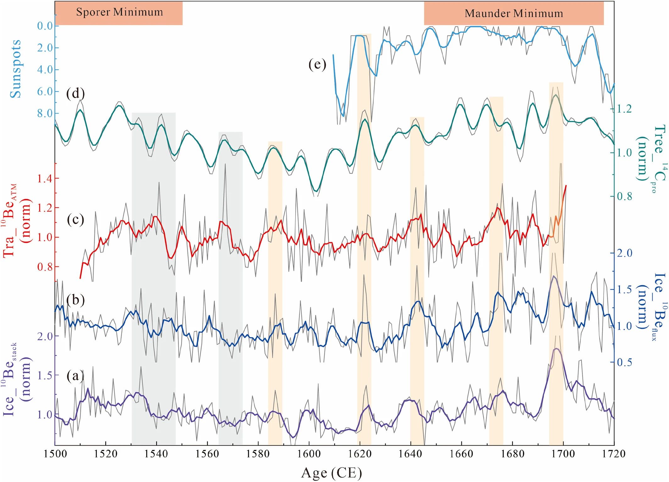 图为研究时段内钙华10Be记录(c)与冰芯10Be记录(a和b)、树轮14C记录(d)以及太阳黑子记录(e)间的趋势变化对比