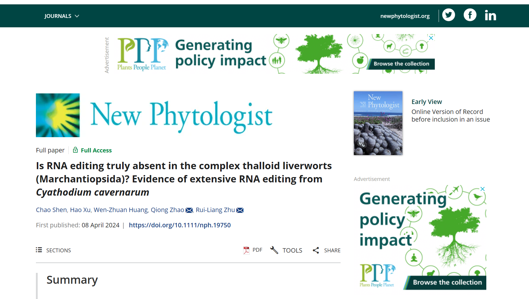 光苔是以洞穴为主要生境的一类地钱纲植物,在弱光下有发光特征,目前只有一个科一个属,全世界只有12个种,大多是稀有和保护物种。基于复杂叶状体的全面取样,通过对产于广西洞穴的野生材料进行无菌培养和基因组测序以及相关实验分析,生命科学学院朱瑞良教授、赵琼研究员团队发现光苔具有丰富的C-to-U RNA编辑位点,并且证实光苔同时具有大量PPR编辑因子,包括251个DYW型PPR蛋白。研究人员推测光苔显著的RNA编辑能力可能是随着DYW型PPR编辑因子的出现而获得,并提出了二种假说。这些发现有助于深入了解陆地植物RNA编辑的进化模式。随着光苔人工培养体系的建立和后续光苔全基因组序列的发表,光苔有望成为进一步研究陆生植物RNA编辑的一个理想的模式植物。该研究成果于4月在New Phytologist上发表。