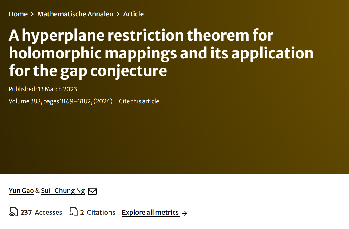 数学科学学院吴瑞聪研究员与其合作者上海交通大学高云副教授最近建立了一个簇新的全纯映射超平面限制定理,用于研究广义球之间的全纯逆紧映射。除了成功确立单位球间隙猜想中的间隙的一般存在性,也同时把间隙现象推广到广义球上。相关研究成果于3月1日以“A hyperplane restriction theorem for holomorphic mappings and its application for the gap conjecture”为题发表在Mathematische Annalen。数学科学学院吴瑞聪研究员为通讯作者。