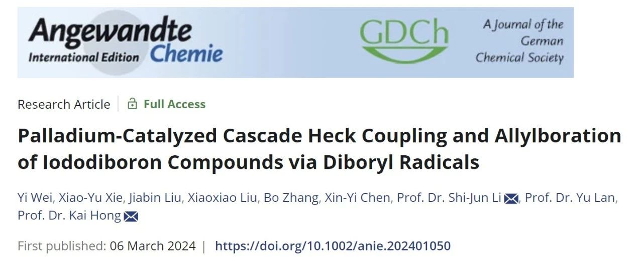 化学与分子工程学院洪恺研究员团队与郑州大学李世俊/蓝宇团队合作,报道了钯催化α-碘代偕二硼酸酯与烯烃以及醛/亚胺的三组分反应,揭示了α-碘代偕二硼酸酯的两可活性。该方法条件简单、底物范围广,对各种类型的官能团和杂环都有着良好的兼容性,为快速构建多官能团化的含硼有机化合物提供了新的途径。该研究成果发表在Angewandte Chemie International Edition上。