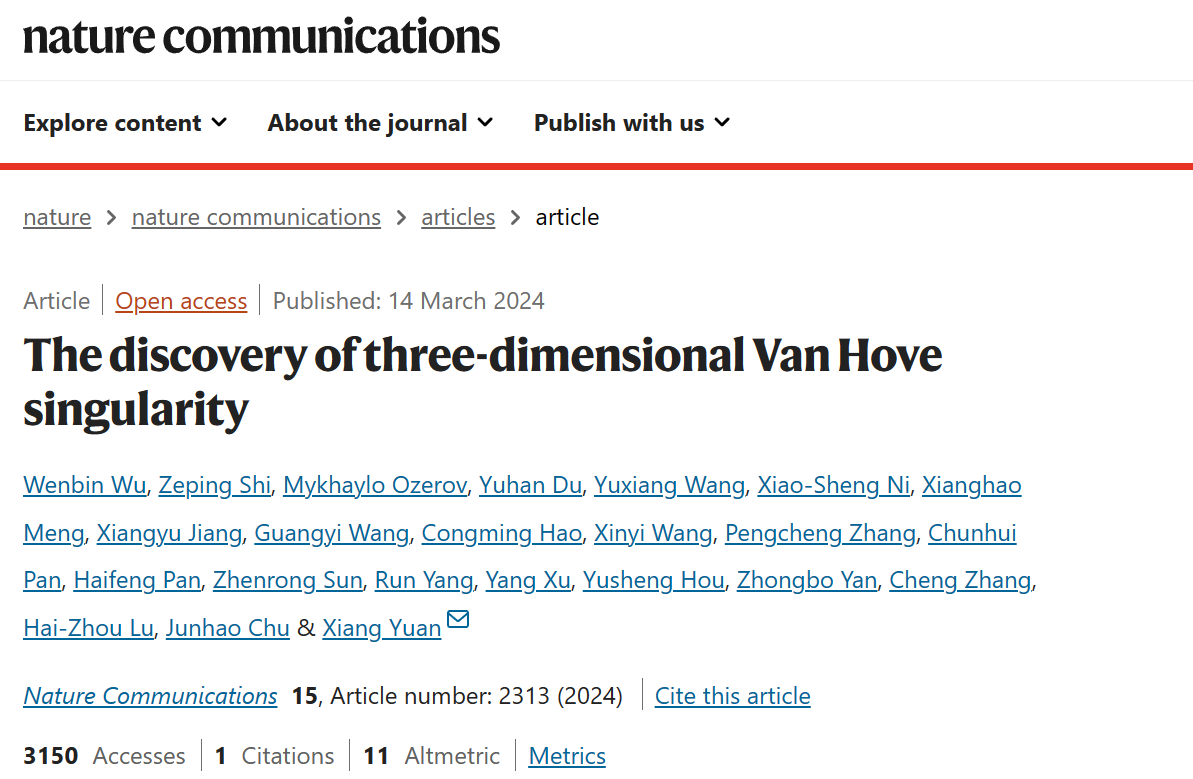 精密光谱科学与技术国家重点实验室袁翔教授研究团队利用自主搭建的强磁场红外光谱系统在拓扑磁体EuCd2As2中发现了三维范霍夫奇点。通常,范霍夫奇点被认为仅存在于一维和二维系统中,在三维系统中十分罕见,少数的例子也往往是在准二维的层状三维晶体中。研究团队的这一工作发现了严格的三维外尔半金属系统中也允许存在范霍夫奇点。研究成果以“The discovery of three-dimensional Van Hove singularity”为题发表于Nature Communications,博士研究生吴闻彬和施泽平为论文的共同第一作者,袁翔教授为论文通讯作者。