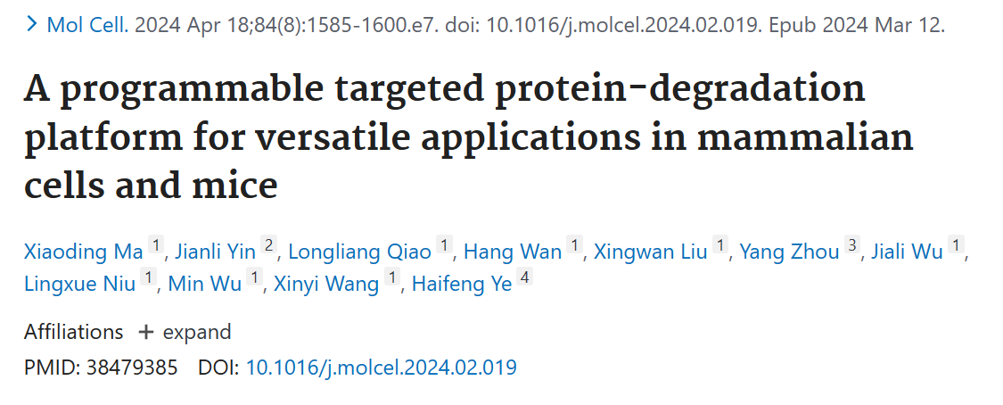 相关成果于3月12日以“A programmable targeted protein degradation platform for versatile applications in mammalian cells and mice”为题,发表在《细胞》(Cell)杂志子刊Molecular Cell。