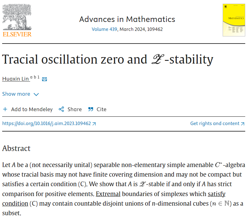 最近,林华新教授又引入算子代数的迹零震荡概念(tracial oscillation zero),证明了分类纲领中至关重要的Z-稳定与正元严格比较的等价性问题,从而对相对广泛的无单元C*-代数证明了分类纲领中著名的“Tom-Winter猜想”。有关论文今年3月发表于Advances in Mathematics。