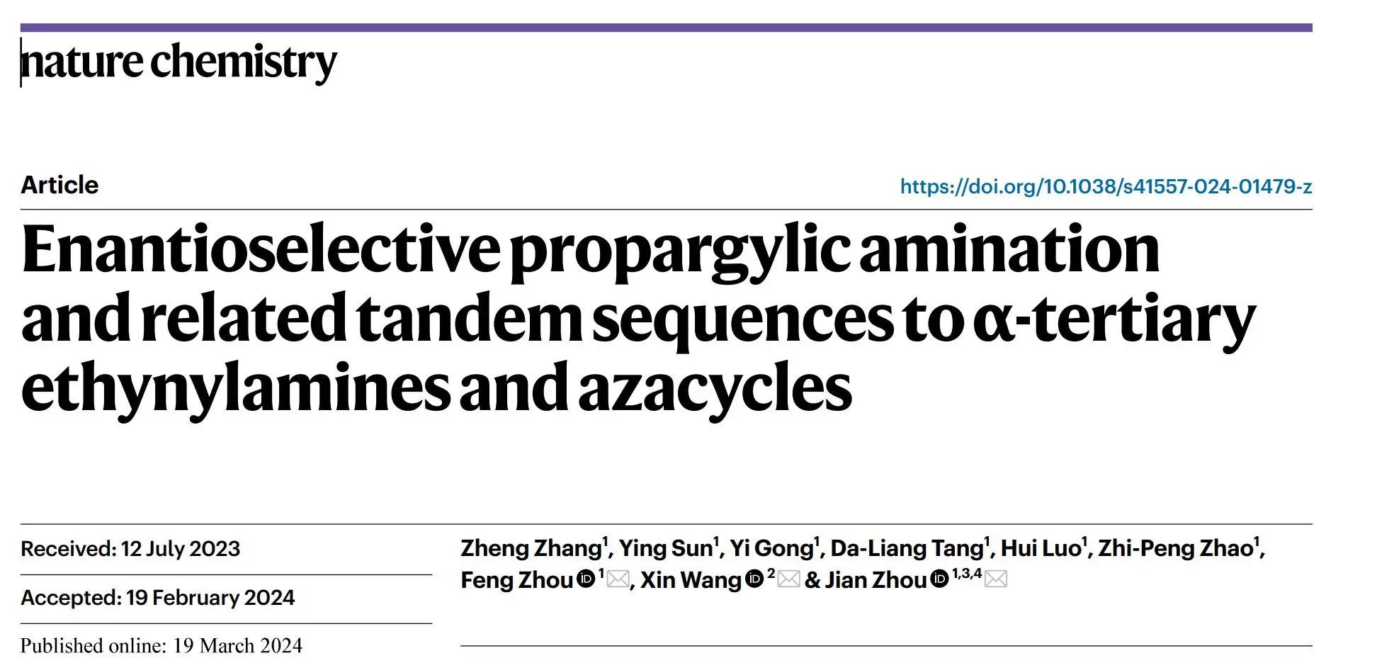 利用不对称催化高效获得手性化合物,是合成化学的前沿研究领域。化学与分子工程学院周剑和周锋教授团队在远程手性控制不对称催化反应方面取得重要进展。研究团队设计发展了空间受限的新手性传导型配体,实现了高对映选择性和底物普适性的普通炔丙醇衍生物的不对称胺化反应,为合成药物研发中具有重要应用的乙炔基取代手性α-叔胺以及串联合成具有氮杂手性季碳杂环化合物提供了高效的合成策略,研究成果发表在Nature Chemistry。